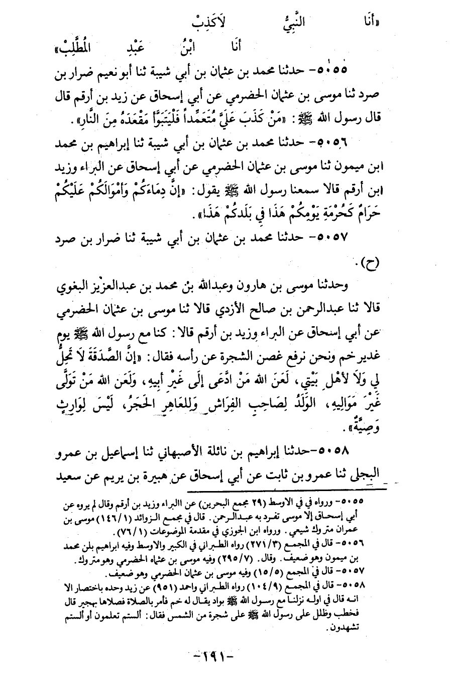 5055 - حَدَّثَنَا مُحَمَّدُ بْنُ عُثْمَانَ بْنِ أَبِي شَيْبَةَ، ثنا أَبُو نُعَيْمٍ ضِرَارُ بْنُ صُرَدٍ، ثنا مُوسَى بْنُ عُثْمَانَ الْحَضْرَمِيُّ، عَنْ أَبِي إِسْحَاقَ، عَنْ زَيْدِ بْنِ أَرْقَمَ، قَالَ: قَالَ رَسُولُ اللهِ صَلَّى اللهُ عَلَيْهِ وَسَلَّمَ: «§مَنْ كَذَبَ عَلَيَّ مُتَعَمِّدًا فَلْيَتَبَوَّأْ مَقْعَدَهُ مِنَ النَّارِ»