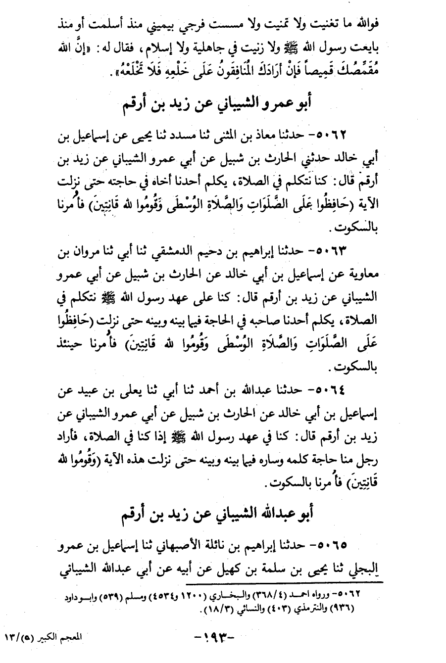 5063 - حَدَّثَنَا إِبْرَاهِيمُ بْنُ دُحَيْمٍ الدِّمَشْقِيُّ، ثنا أَبِي، ثنا مَرْوَانُ بْنُ مُعَاوِيَةَ، عَنْ إِسْمَاعِيلَ بْنِ أَبِي خَالِدٍ، عَنِ الْحَارِثِ بْنِ شُبَيْلٍ، عَنْ أَبِي عَمْرٍو الشَّيْبَانِيِّ، عَنْ زَيْدِ بْنِ أَرْقَمَ، قَالَ: " كُنَّا عَلَى عَهْدِ رَسُولِ اللهِ صَلَّى اللهُ عَلَيْهِ وَسَلَّمَ §نَتَكَلَّمُ فِي الصَّلَاةِ يُكَلِّمُ أَحَدُنَا صَاحِبَهُ فِي الْحَاجَةِ فِيمَا بَيْنَهُ وَبَيْنَهُ حَتَّى نَزَلَتْ {حَافِظُوا عَلَى الصَّلَوَاتِ وَالصَّلَاةِ الْوُسْطَى وَقُومُوا لِلَّهِ قَانِتِينَ} [البقرة: 238] فَأُمِرْنَا حِينَئِذٍ بِالسُّكُوتِ "