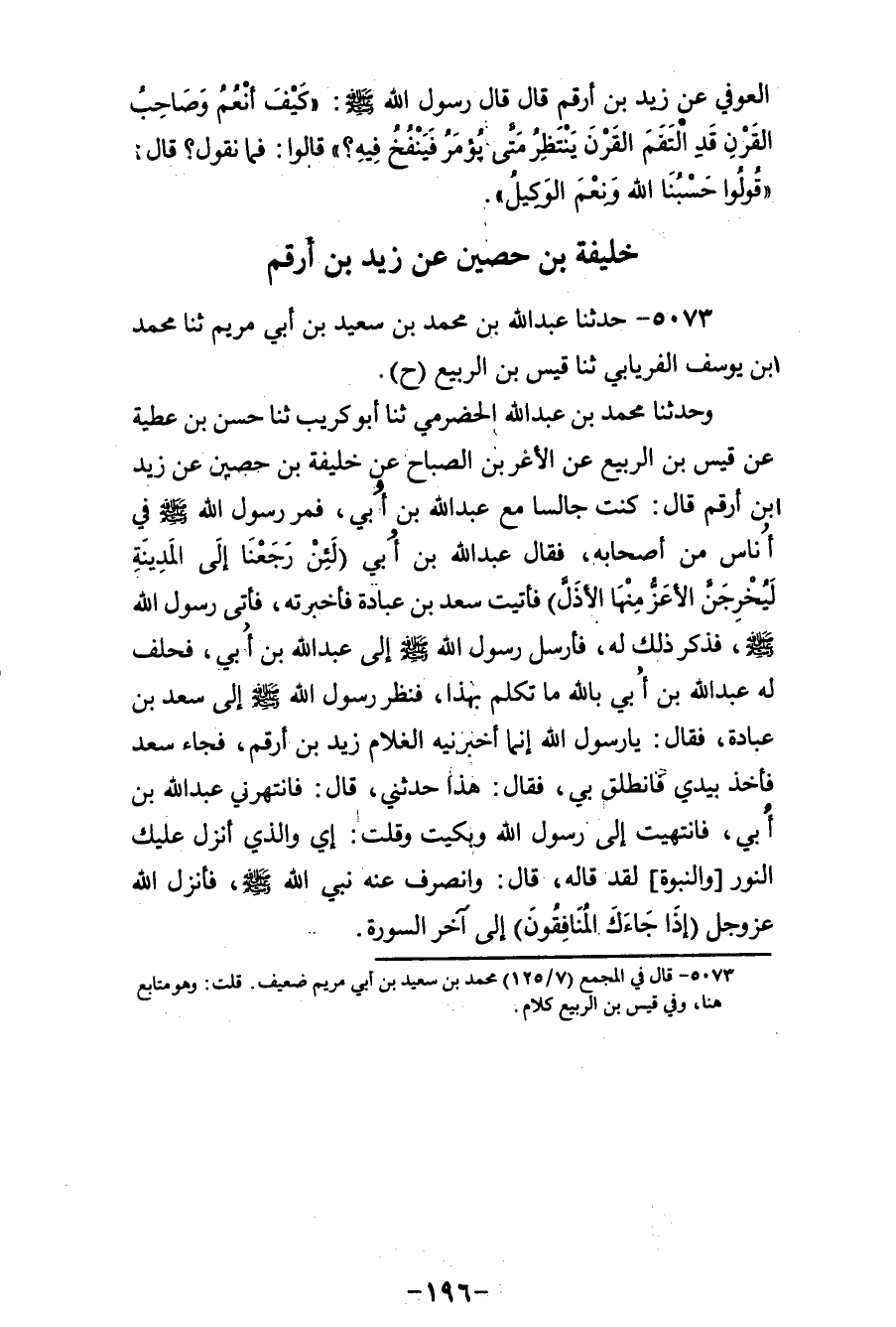 5073 - حَدَّثَنَا عَبْدُ اللهِ بْنُ مُحَمَّدِ بْنِ سَعِيدِ بْنِ أَبِي مَرْيَمَ، ثنا مُحَمَّدُ بْنُ يُوسُفَ الْفِرْيَابِيُّ، ثنا قَيْسُ بْنُ الرَّبِيعِ، ح وَحَدَّثَنَا مُحَمَّدُ بْنُ عَبْدِ اللهِ الْحَضْرَمِيُّ، ثنا أَبُو كُرَيْبٍ، ثنا حَسَنُ بْنُ عَطِيَّةَ، عَنْ قَيْسِ بْنِ الرَّبِيعِ، عَنِ الْأَغَرِّ بْنِ الصَّبَّاحِ، عَنْ خَلِيفَةَ بْنِ حُصَيْنٍ، عَنْ زَيْدِ بْنِ أَرْقَمَ، قَالَ: " كُنْتُ جَالِسًا مَعَ عَبْدِ اللهِ بْنِ أُبَيٍّ فَمَرَّ رَسُولُ اللهِ صَلَّى اللهُ عَلَيْهِ وَسَلَّمَ فِي أُنَاسٍ مِنْ أَصْحَابِهِ، فَقَالَ عَبْدُ اللهِ بْنُ أُبَيٍّ: {لَئِنْ رَجَعْنَا إِلَى الْمَدِينَةِ لَيُخْرِجَنَّ الْأَعَزُّ مِنْهَا الْأَذَلَّ} [المنافقون: 8] ، فَأَتَيْتُ سَعْدَ بْنَ عُبَادَةَ فَأَخْبَرْتُهُ، فَأَتَى رَسُولَ اللهِ صَلَّى اللهُ عَلَيْهِ وَسَلَّمَ فَذَكَرَ ذَلِكَ لَهُ، §فَأَرْسَلَ رَسُولُ اللهِ صَلَّى اللهُ عَلَيْهِ وَسَلَّمَ إِلَى عَبْدِ اللهِ بْنِ أُبَيٍّ، فَحَلَفَ لَهُ عَبْدُ اللهِ بْنُ أُبَيٍّ بِاللهِ مَا تَكَلَّمَ بِهَذَا، فَنَظَرَ رَسُولُ اللهِ صَلَّى اللهُ عَلَيْهِ وَسَلَّمَ إِلَى سَعْدِ بْنِ عُبَادَةَ، فَقَالَ: يَا رَسُولَ اللهِ، إِنَّمَا أَخْبَرَنِيهِ الْغُلَامُ زَيْدُ بْنُ أَرْقَمَ، فَجَاءَ سَعْدٌ فَأَخَذَ بِيَدِي فَانْطَلَقَ بِي، فَقَالَ: هَذَا حَدَّثَنِي، قَالَ: فَانْتَهَرَنِي عَبْدُ اللهِ بْنُ أُبَيٍّ، فَانْتَهَيْتُ إِلَى رَسُولِ اللهِ وَبَكَيْتُ، وَقُلْتُ: إِيْ وَالَّذِي أَنْزَلَ عَلَيْكَ النُّورَ وَالنُّبُوَّةَ لَقَدْ قَالَهُ، قَالَ: وَانْصَرَفَ عَنْهُ نَبِيُّ اللهِ صَلَّى اللهُ عَلَيْهِ وَسَلَّمَ، فَأَنْزَلَ اللهُ عَزَّ وَجَلَّ {إِذَا جَاءَكَ الْمُنَافِقُونَ} [المنافقون: 1] " إِلَى آخِرِ السُّورَةِ