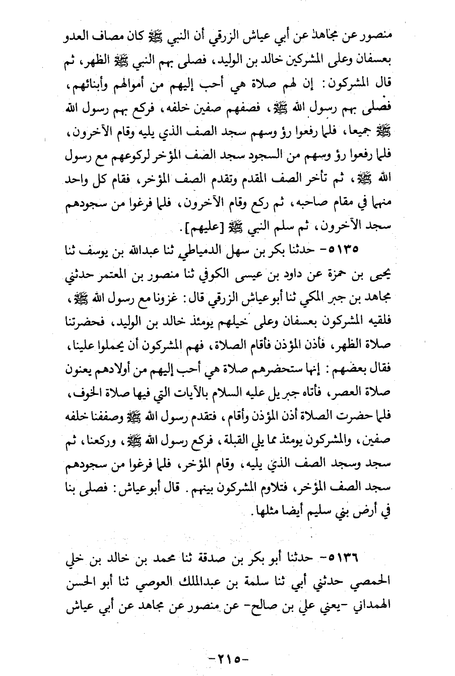 5135 - حَدَّثَنَا بَكْرُ بْنُ سَهْلٍ الدِّمْيَاطِيُّ، ثنا عَبْدُ اللهِ بْنُ يُوسُفَ، ثنا يَحْيَى بْنُ حَمْزَةَ، عَنْ دَاوُدَ بْنِ عِيسَى الْكُوفِيِّ، ثنا مَنْصُورُ بْنُ الْمُعْتَمِرِ، حَدَّثَنِي مُجَاهِدُ بْنُ جَبْرٍ الْمَكِّيُّ، ثنا أَبُو عَيَّاشٍ الزُّرَقِيُّ، قَالَ: غَزَوْنَا مَعَ رَسُولِ اللهِ صَلَّى اللهُ عَلَيْهِ وَسَلَّمَ، فَلَقِيَهِ الْمُشْرِكُونَ بِعُسْفَانَ وَعَلَى خَيْلِهِمْ يَوْمَئِذٍ خَالِدُ بْنُ الْوَلِيدِ، فَحَضَرَتْنَا صَلَاةُ الظُّهْرِ، فَأَذَّنَ الْمُؤَذِّنُ فَأَقَامَ الصَّلَاةَ، فَهَمَّ الْمُشْرِكُونَ أَنْ يَحْمِلُوا عَلَيْنَا، فَقَالَ بَعْضُهُمْ: إِنَّهَا سَتَحْضُرُهُمْ صَلَاةٌ هِيَ أَحَبُّ إِلَيْهِمْ مِنْ أَوْلَادِهِمْ، يَعْنُونَ صَلَاةَ الْعَصْرِ، فَأَتَاهُ جِبْرِيلُ عَلَيْهِ السَّلَامُ بِالْآيَاتِ الَّتِي فِيهَا صَلَاةُ الْخَوْفِ، «فَلَمَّا حَضَرَتِ الصَّلَاةُ أَذَّنَ الْمُؤَذِّنُ وَأَقَامَ، §فَتَقَدَّمَ رَسُولُ اللهِ صَلَّى اللهُ عَلَيْهِ وَسَلَّمَ وَصَفَفْنَا خَلْفَهُ صَفَّيْنِ، وَالْمُشْرِكُونَ يَوْمَئِذٍ مِمَّا يَلِي الْقِبْلَةَ، فَرَكَعَ رَسُولُ اللهِ صَلَّى اللهُ عَلَيْهِ وَسَلَّمَ وَرَكَعْنَا، ثُمَّ سَجَدَ وَسَجَدَ الصَّفُّ الَّذِي يَلِيهِ، وَقَامَ الْمُؤَخَّرُ، فَلَمَّا فَرَغُوا مِنْ سُجُودِهِمْ سَجَدَ الصَّفُّ الْمُؤَخَّرُ، فَتَلَاوَمَ الْمُشْرِكُونَ بَيْنَهُمْ» قَالَ أَبُو عَيَّاشٍ: «فَصَلَّى بِنَا فِي أَرْضِ بَنِي سُلَيْمٍ أَيْضًا مِثْلَهَا»