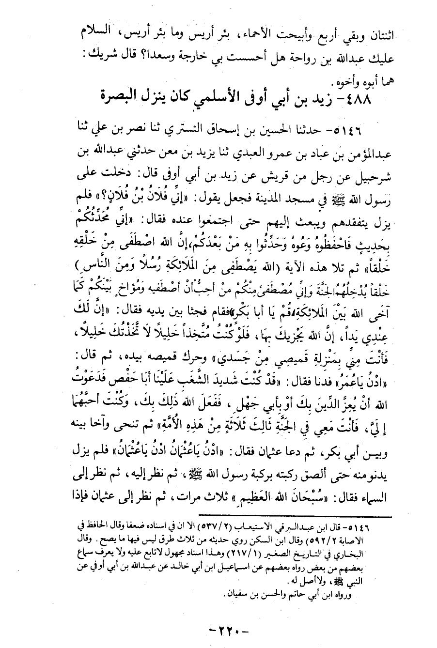 5146 - حَدَّثَنَا الْحُسَيْنُ بْنُ إِسْحَاقَ التُّسْتَرِيُّ، ثنا نَصْرُ بْنُ عَلِيٍّ، ثنا عَبْدُ الْمُؤْمِنِ بْنُ عَبَّادِ بْنِ عَمْرٍو الْعَبْدِيُّ، ثنا يَزِيدُ بْنُ مَعْنٍ، حَدَّثَنِي عَبْدُ اللهِ بْنُ شُرَحْبِيلَ، عَنْ رَجُلٍ، مِنْ قُرَيْشٍ، عَنْ زَيْدِ بْنِ أَبِي أَوْفَى، قَالَ: دَخَلْتُ عَلَى رَسُولِ اللهِ صَلَّى اللهُ عَلَيْهِ وَسَلَّمَ فِي مَسْجِدِ الْمَدِينَةِ، فَجَعَلَ يَقُولُ: «أَيْنَ فُلَانُ بْنُ فُلَانٍ» فَلَمْ يَزَلْ يَتَفَقَّدُهُمْ وَيَبْعَثُ إِلَيْهِمْ حَتَّى اجْتَمَعُوا عِنْدَهُ، فَقَالَ: «إِنِّي مُحَدِّثُكُمْ بِحَدِيثٍ فَاحْفَظُوهُ وَعُوهُ وَحَدِّثُوا بِهِ مَنْ بَعْدَكُمْ، إِنَّ اللهَ اصْطَفَى مِنْ خَلْقِهِ خَلْقًا» ثُمَّ تَلَا هَذِهِ الْآيَةَ {اللهُ يَصْطَفِي مِنَ الْمَلَائِكَةِ رُسُلًا وَمِنَ النَّاسِ} [الحج: 75] «خَلْقًا يُدْخِلُهُمُ الْجَنَّةَ، وَإِنِّي مُصْطَفًى مِنْكُمْ مَنْ أَحَبَّ أَنْ أَصْطَفِيَهُ ومُؤَاخٍ بَيْنَكُمْ كَمَا آخَى اللهُ بَيْنَ الْمَلَائِكَةِ، قُمْ يَا أَبَا بَكْرٍ» فَقَامَ فَجَثَا بَيْنَ يَدَيْهِ، فَقَالَ: «إِنَّ لَكَ عِنْدِي يَدًا، إِنَّ اللهَ يَجْزِيكَ بِهَا، فَلَوْ كُنْتُ مُتَّخِذًا خَلِيلًا لَاتَّخَذْتُكَ خَلِيلًا، فَأَنْتَ مِنِّي بِمَنْزِلَةِ قَمِيصِي مِنْ جَسَدِي» وَحَرَّكَ قَمِيصَهُ بِيَدِهِ، ثُمَّ قَالَ: «ادْنُ يَا عُمَرً» ، فَدَنَا فَقَالَ: «قَدْ كُنْتَ شَدِيدَ الشَّغَبِ عَلَيْنَا أَبَا حَفْصٍ فَدَعَوْتُ اللهَ أَنْ يُعِزَّ الدِّينَ بِكَ أَوْ بِأَبِي جَهْلٍ، فَفَعَلَ اللهُ ذَلِكَ بِكَ، وَكُنْتَ أَحَبَّهُمَا إِلَيَّ، فَأَنْتَ مَعِي فِي الْجَنَّةِ ثَالِثُ ثَلَاثَةٍ مِنْ هَذِهِ الْأُمَّةِ» ثُمَّ تَنَحَّى وآخا بَيْنَهُ وَبَيْنَ أَبِي بَكْرٍ، ثُمَّ دَعَا عُثْمَانَ، فَقَالَ: «ادْنُ يَا عُثْمَانُ، ادْنُ يَا عُثْمَانُ» فَلَمْ يَزَلْ يَدْنُو مِنْهُ حَتَّى أَلْصَقَ رُكْبَتِهِ بِرُكْبَةِ رَسُولِ اللهِ صَلَّى اللهُ عَلَيْهِ وَسَلَّمَ، ثُمَّ نَظَرَ إِلَيْهِ، ثُمَّ نَظَرَ إِلَى السَّمَاءِ، فَقَالَ: «سُبْحَانَ اللهِ الْعَظِيمِ» ثَلَاثَ مَرَّاتٍ، ثُمَّ نَظَرَ إِلَى عُثْمَانَ، فَإِذَا -[221]- أَزْرَارُهُ مَحْلُولَةٌ، فَزَرَّرَهَا رَسُولُ اللهِ صَلَّى اللهُ عَلَيْهِ وَسَلَّمَ بِيَدِهِ، ثُمَّ قَالَ: " §اجْمَعْ عِطْفَيْ رِدَائِكَ عَلَى نَحْرِكَ، فَإِنَّ لَكَ شَأْنًا فِي أَهْلِ السَّمَاءِ، أَنْتَ مِمَّنْ يَرِدُ عَلَيَّ الْحَوْضَ وَأَوْدَاجُهُ تَشْخُبُ دَمًا، فَأَقُولُ: مَنْ فَعَلَ هَذَا بِكَ؟ فَتَقُولُ فُلَانٌ وَفُلَانٌ، وَذَلِكَ كَلَامُ جِبْرِيلَ عَلَيْهِ السَّلَامُ وَذَلِكَ إِذْ هَتَفَ مِنَ السَّمَاءِ إِلَّا إِنَّ عُثْمَانَ أَمِينٌ عَلَى كُلِّ خَاذِلٍ " ثُمَّ دَعَا عَبْدَ الرَّحْمَنِ بْنَ عَوْفٍ، فَقَالَ: «ادْنُ يَا أَمِينَ اللهِ وَالْأَمِينُ فِي السَّمَاءِ يُسَلِّطُكَ اللهُ عَلَى مَالِكَ بِالْحَقِّ، أَمَا إِنَّ لَكَ عِنْدِي دَعْوَةً وَقَدْ أَخَّرْتُهَا» قَالَ: خِرْ لِي يَا رَسُولَ اللهِ، قَالَ: «حَمَّلْتَنِي يَا عَبْدَ الرَّحْمَنِ أَمَانَةً أَكْثَرَ اللهُ مَالَكَ» ، قَالَ: وَجَعَلَ يُحَرِّكُ يَدَهُ، ثُمَّ تَنَحَّى وَآخَى بَيْنَهُ وَبَيْنَ عُثْمَانَ، ثُمَّ دَخَلَ طَلْحَةُ وَالزُّبَيْرُ، فَقَالَ: «ادْنُوَا مِنِّي» فَدَنَوَا مِنْهُ فَقَالَ: «أَنْتُمَا حَوَارِيِّيَّ كَحَوَارِيِّي عِيسَى ابْنِ مَرْيَمَ عَلَيْهِ السَّلَامُ» ثُمَّ آخَى بَيْنَهُمَا، ثُمَّ دَعَا سَعْدَ بْنَ أَبِي وَقَّاصٍ وَعَمَّارَ بْنَ يَاسِرٍ، فَقَالَ: «يَا عَمَّارُ تَقْتُلُكُ الْفِئَةُ الْبَاغِيَةُ» ثُمَّ آخَى بَيْنَهُمَا، ثُمَّ دَعَا عُوَيْمِرًا أَبَا لدَّرْدَاءِ وَسَلْمَانَ الْفَارِسِيِّ، فَقَالَ: «يَا سَلْمَانُ أَنْتَ مِنَّا أَهْلَ الْبَيْتِ، وَقَدْ آتَاكَ اللهُ الْ