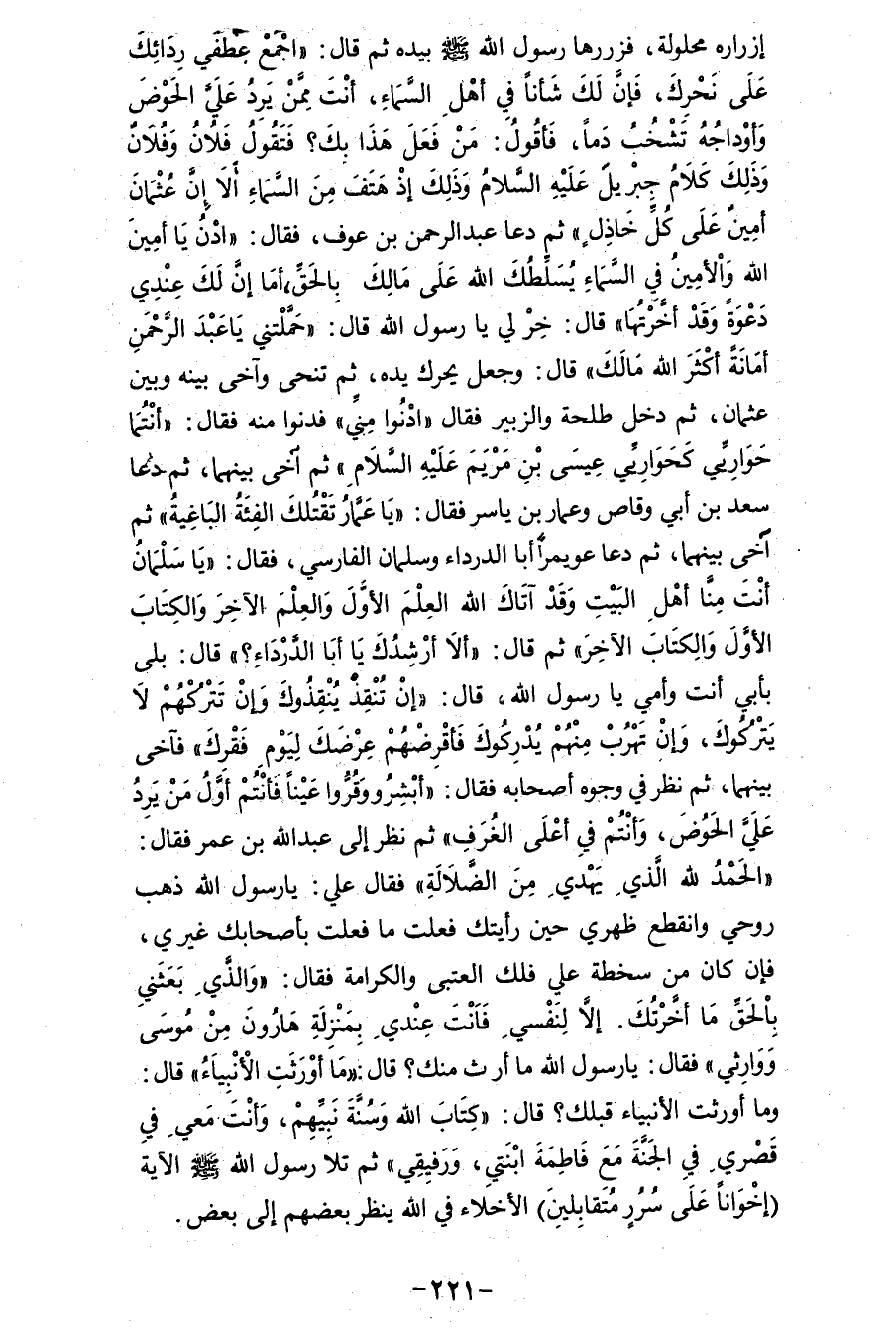 أَنْتَ مِمَّنْ يَرِدُ عَلَيَّ الْحَوْضَ وَأَوْدَاجُهُ تَشْخُبُ دَمًا ، فَأَقُولُ : مَنْ فَعَلَ هَذَا بِكَ ؟ فَتَقُولُ فُلاَنٌ وَفُلاَنٌ ، وَذَلِكَ كَلاَمُ جِبْرِيلَ عَلَيْهِ السَّلاَمُ وَذَلِكَ إِذْ هَتَفَ مِنَ السَّمَاءِ إِلاَّ إِنَّ عُثْمَانَ أَمِينٌ عَلَى كُلِّ خَاذِلٍ ثُمَّ دَعَا عَبْدَ الرَّحْمَنِ بْنَ عَوْفٍ ، فَقَالَ : ادْنُ يَا أَمِينَ اللهِ وَالأَمِينُ فِي السَّمَاءِ يُسَلِّطُكَ اللَّهُ عَلَى مَالِكَ بِالْحَقِّ ، أَمَا إِنَّ لَكَ عِنْدِي دَعْوَةً وَقَدْ أَخَّرْتُهَا قَالَ : خِرْ لِي يَا رَسُولَ اللهِ ، قَالَ : حَمَّلْتَنِي يَا عَبْدَ الرَّحْمَنِ أَمَانَةً أَكْثَرَ اللَّهُ مَالَكَ ، قَالَ : وَجَعَلَ يُحَرِّكُ يَدَهُ ، ثُمَّ تَنَحَّى وَآخَى بَيْنَهُ وَبَيْنَ عُثْمَانَ ، ثُمَّ دَخَلَ طَلْحَةُ وَالزُّبَيْرُ ، فَقَالَ : ادْنُوَا مِنِّي فَدَنَوَا مِنْهُ فَقَالَ : أَنْتُمَا حَوَارِيِّيَّ كَحَوَارِيِّي عِيسَى ابْنِ مَرْيَمَ عَلَيْهِ السَّلاَمُ ثُمَّ آخَى بَيْنَهُمَا ، ثُمَّ دَعَا سَعْدَ بْنَ أَبِي وَقَّاصٍ وَعَمَّارَ بْنَ يَاسِرٍ ، فَقَالَ : يَا عَمَّارُ تَقْتُلُكُ الْفِئَةُ الْبَاغِيَةُ ثُمَّ آخَى بَيْنَهُمَا ، ثُمَّ دَعَا عُوَيْمِرًا أَبَا لدَّرْدَاءِ وَسَلْمَانَ الْفَارِسِيِّ ، فَقَالَ : يَا سَلْمَانُ أَنْتَ مِنَّا أَهْلَ الْبَيْتِ ، وَقَدْ آتَاكَ اللَّهُ الْعِلْمَ الأَوَّلَ وَالْعِلْمَ الآخِرَ وَالْكِتَابَ الأَوَّلَ وَالْكِتَابَ الآخِرَ ثُمَّ قَالَ : أَلاَ أَرْشَدُكَ يَا أَبَا الدَّرْدَاءِ ؟ قَالَ : بَلَى بِأَبِي أَنْتَ وَأُمِّي يَا رَسُولَ اللهِ ، قَالَ : أَنْ تُنْقِذْ يُنْقِذُوكَ وَإِنْ تَتْرُكْهُمْ لاَ يَتْرُكُوكَ ، وَإِنْ تَهْرَبْ مِنْهُمْ يُدْرِكُوكَ فَأَقْرِضْهُمْ عِرْضَكَ لِيَوْمِ فَقْرِكَ فَآخَى بَيْنَهُمَا ، ثُمَّ نَظَرَ فِي وُجُوهِ أَصْحَابِهِ ، فَقَالَ : أَبْشِرُوا وقَرُّوا عَيْنًا فَأَنْتُمْ أَوَّلُ مَنْ يَرِدُ عَلَيَّ الْحَوْضَ ، وَأَنْتُمْ فِي أَعْلَى الْغُرَفِ ثُمَّ نَظَرَ إِلَى عَبْدِ اللهِ بْنِ عُمَرَ ، فَقَالَ : الْحَمْدُ لِلَّهِ الَّذِي يَهْدِي مِنَ الضَّلاَلَةِ فَقَالَ عَلِيٌّ : يَا رَسُولَ اللهِ ذَهَبَ رُوحِي وَانْقَطَعَ ظَهْرِي حِينَ رَأَيْتُكَ فَعَلْتَ مَا فَعَلْتَ بِأَصْحَابِكَ غَيْرِي ، فَإِنْ كَانَ مِنْ سَخْطَةٍ عَلَيَّ فَلَكَ الْعُتْبَى وَالْكَرَامَةُ ، فَقَالَ : وَالَّذِي بَعَثَنِي بِالْحَقِّ مَا أخَّرْتُكَ إِلاَّ لِنَفْسِي ، فَأَنْتَ عِنْدِي بِمَنْزِلَةِ هَارُونَ مِنْ مُوسَى وَوَارِثِي فَقَالَ : يَا رَسُولَ اللهِ ، مَا أَرِثُ مِنْكَ ؟ قَالَ : مَا أَوْرَثَتِ الأَنْبِيَاءُ قَالَ : وَمَا أَوْرَثَتِ الأَنْبِيَاءُ قَبْلَكَ ؟ قَالَ : كِتَابَ اللهِ وَسُنَّةَ نَبِيِّهِمْ ، وَأَنْتَ مَعِي فِي قِصْرِي فِي الْجَنَّةِ مَعَ فَاطِمَةَ ابْنَتِي ، وَرَفِيقِي ثُمَّ تَلاَ رَسُولُ اللهِ صَلَّى اللَّهُ عَلَيْهِ وَسَلَّمَ الآيَةَ {إِخْوَانًا عَلَى سُرَرٍ مُتَقَابِلِينَ} الأَخِلاَّءُ فِي اللهِ يَنْظُرُ بَعْضُهُمْ إِلَى بَعْضٍ.