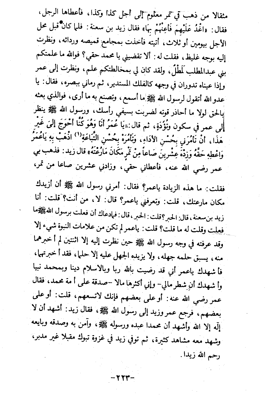 أَتَيْتُهُ فَأَخَذْتُ بِمَجَامِعِ قَمِيصِهِ وَرِدَائِهِ ، وَنَظَرْتُ إِلَيْهِ بِوَجْهٍ غَلِيظٍ ، فَقُلْتُ لَهُ : أَلاَ تَقْضِيَنِي يَا مُحَمَّدُ حَقِّي ؟ فَوَاللَّهِ مَا عَلِمْتُكُمْ بَنِي عَبْدِ الْمُطَّلِبِ لَمَطْلٌ ، وَلَقَدْ كَانَ لِي بِمُخَالَطَتِكُمْ عَلِمٌ ، وَنَظَرْتُ إِلَى عُمَرَ ، وَإِذَا عَيْنَاهُ تَدُورَانِ فِي وَجْهِهِ كالْفَلَكِ الْمُسْتَدِيرِ ، ثُمَّ رَمَانِي بِبَصَرِهِ ، فَقَالَ : يَا عَدُوَّ اللهِ أَتَقُولُ لِرَسُولِ اللهِ صَلَّى اللَّهُ عَلَيْهِ وَسَلَّمَ مَا أَسْمَعُ ، وَتَصْنَعُ بِهِ مَا أَرَى ، فَوَالَّذِي بَعَثَهُ بِالْحَقِّ لَوْلاَ مَا أُحَاذِرُ فَوْتَهُ لَضَرَبْتُ بِسَيْفِي رَأْسَكَ ، وَرَسُولُ اللهِ صَلَّى اللَّهُ عَلَيْهِ وَسَلَّمَ يَنْظُرُ إِلَى عُمَرَ فِي سُكُونٍ وتُؤَدَةٍ ، ثُمَّ قَالَ : يَا عُمَرُ ، أَخْبَرَنَا وَهُوَ كُنَّا أَحْوَجَ إِلَى غَيْرِ هَذَا ، أَنْ تَأْمُرَنِي بِحُسْنِ الأَدَاءِ ، وتَأْمُرَهُ بِحُسْنِ التِّبَاعَةِ ، اذْهَبْ بِهِ يَا عُمَرُ وأَعْطِهِ حَقَّهُ وَزِدْهُ عِشْرِينَ صَاعًا مِنْ تَمْرٍ مَكَانَ مَا رَوَّعْتَهُ قَالَ زَيْدٌ : فَذَهَبَ بِي عُمَرُ رَضِيَ اللَّهُ عَنْهُ ، فَأَعْطَانِي حَقِّي ، وَزَادَنِي عِشْرِينَ صَاعًا مِنْ تَمْرٍ ، فَقُلْتُ : مَا هَذِهِ الزِّيَادَةُ يَا عُمَرُ ؟ فَقَالَ : أَمَرَنِي رَسُولُ اللهِ صَلَّى اللَّهُ عَلَيْهِ وَسَلَّمَ أَنْ أَزِيدَكَ مَكَانَ مَا رَوَّعْتُكَ ، قُلْتُ : وتَعْرِفُنِي يَا عُمَرُ ؟ قَالَ : لاَ ، مَنْ أَنْتَ ؟ قُلْتُ : أَنَا زَيْدُ بْنُ سَعْنَةَ ، قَالَ : الْحَبْرُ ، قُلْتُ : الْحَبْرُ ، قَالَ : فَمَا دَعَاكَ أَنْ فَعَلْتَ بِرَسُولِ اللهِ صَلَّى اللَّهُ عَلَيْهِ وَسَلَّمَ مَا فَعَلْتَ وَقُلْتَ لَهُ مَا قُلْتَ ؟ قُلْتُ : يَا عُمَرُ ، لَمْ تَكُنْ مِنْ عَلاَمَاتِ النُّبُوَّةِ شَيْءٌ إِلاَّ وَقَدْ عَرَفْتُهُ فِي وَجْهِ رَسُولِ اللهِ صَلَّى اللَّهُ عَلَيْهِ وَسَلَّمَ حِينَ نَظَرْتُ إِلَيْهِ إِلاَّ اثْنَتَيْنِ لَمْ أَخْبُرْهُمَا مِنْهُ ، يَسْبِقُ حِلْمُهُ جَهْلَهُ ، وَلاَ يَزِيدُهُ الْجَهْلُ عَلَيْهِ إِلاَّ حِلْمًا ، فَقَدْ أُخْبِرْتُهُمَا ، فَأُشْهِدُكَ يَا عُمَرُ أَنِّي قَدْ رَضِيتُ بِاللَّهِ رَبًّا وَبِالإِسْلاَمِ دِينًا وَبِمُحَمَّدٍ نَبِيًّا ، وَأُشْهِدُكَ أَنَّ شَطْرَ مَالِي - وَإِنِّي أَكْثَرُهَا مَالاً - صَدَقَةٌ عَلَى أُمَّةِ مُحَمَّدٍ . فَقَالَ عُمَرُ رَضِيَ اللَّهُ عَنْهُ : أَوْ عَلَى بَعْضِهِمْ ، فَإِنَّكَ لاَ تَسَعُهُمْ . قُلْتُ : أَوْ عَلَى بَعْضِهِمْ ، فَرَجَعَ عُمَرُ وَزَيْدٌ إِلَى رَسُولِ اللهِ صَلَّى اللَّهُ عَلَيْهِ وَسَلَّمَ ، فَقَالَ زَيْدٌ : أَشْهَدُ أَنْ لاَ إِلَهَ إِلاَّ اللَّهُ وَأَشْهَدُ أَنَّ مُحَمَّدًا عَبْدُهُ وَرَسُولُهُ صَلَّى اللَّهُ عَلَيْهِ وَسَلَّمَ . وَآمَنَ بِهِ وَصَدَّقَهُ وَبَايَعَهُ وَشَهِدَ مَعَهُ مَشَاهِدَ كَثِيرَةً ، ثُمَّ تُوُفِّي زَيْدٌ فِي غَزْوَةِ تَبُوكَ مُقْبِلاً غَيْرَ مُدْبِرٍ ، رَحِمَ اللَّهُ زَيْدًا.