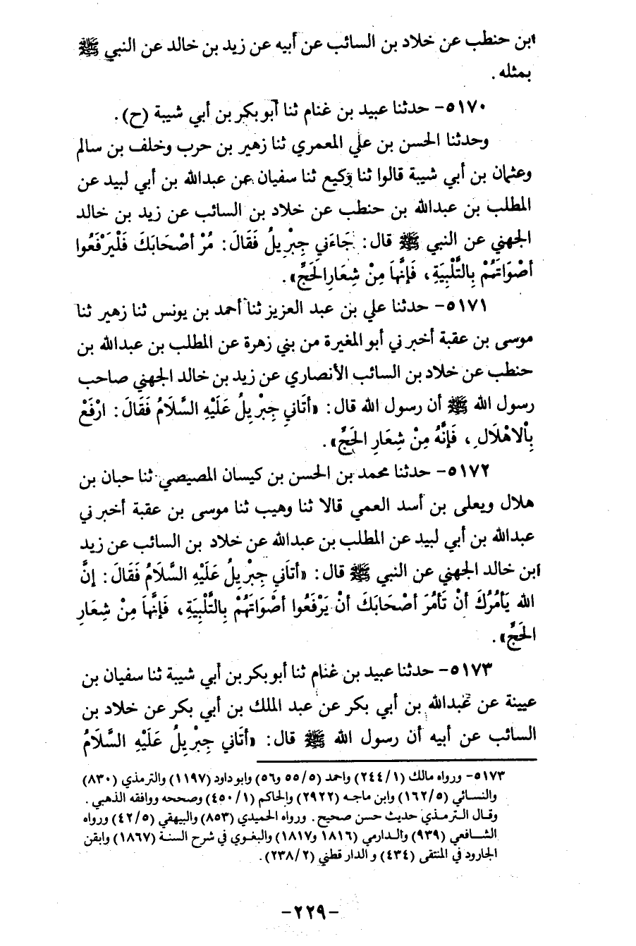 5170 - حَدَّثَنَا عُبَيْدُ بْنُ غَنَّامٍ، ثنا أَبُو بَكْرِ بْنُ أَبِي شَيْبَةَ، ح وَحَدَّثَنَا الْحَسَنُ بْنُ عَلِيٍّ الْمَعْمَرِيُّ، ثنا زُهَيْرُ بْنُ حَرْبٍ، وَخَلَفُ بْنُ سَالِمٍ، وَعُثْمَانُ بْنُ أَبِي شَيْبَةَ، قَالُوا: ثنا وَكِيعٌ، ثنا سُفْيَانُ، عَنْ عَبْدِ اللهِ بْنِ أَبِي لَبِيدٍ، عَنِ الْمُطَّلِبِ بْنِ عَبْدِ اللهِ بْنِ حَنْطَبٍ، عَنْ خَلَّادِ بْنِ السَّائِبِ، عَنْ زَيْدِ بْنِ خَالِدٍ الْجُهَنِيِّ، عَنِ النَّبِيِّ صَلَّى اللهُ عَلَيْهِ وَسَلَّمَ قَالَ: " §جَاءَنِي جِبْرِيلُ فَقَالَ: مُرْ أَصْحَابَكَ فَلْيَرْفَعُوا أَصْوَاتَهُمْ بِالتَّلْبِيَةِ، فَإِنَّهَا مِنْ شِعَارِ الْحَجِّ "