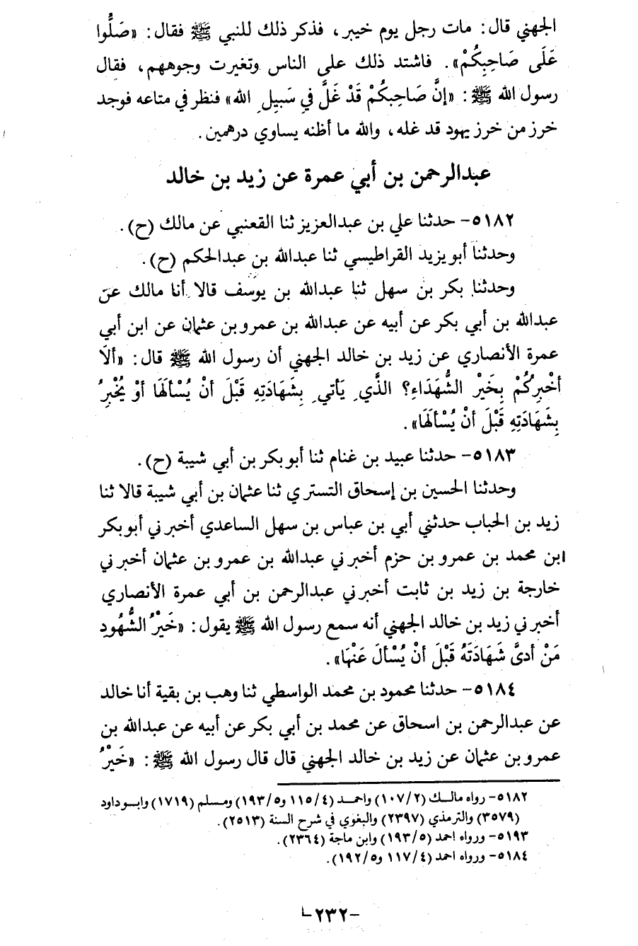 5183 - حَدَّثَنَا عُبَيْدُ بْنُ غَنَّامٍ، ثنا أَبُو بَكْرِ بْنُ أَبِي شَيْبَةَ، ح وَحَدَّثَنَا الْحُسَيْنُ بْنُ إِسْحَاقَ التُّسْتَرِيُّ، ثنا عُثْمَانُ بْنُ أَبِي شَيْبَةَ، قَالَا: ثنا زَيْدُ بْنُ الْحُبَابِ، حَدَّثَنِي أُبَيُّ بْنُ عَبَّاسِ بْنِ سَهْلٍ السَّاعِدِيُّ، أَخْبَرَنِي أَبُو بَكْرِ بْنُ مُحَمَّدِ بْنِ عَمْرِو بْنِ حَزْمٍ، أَخْبَرَنِي عَبْدُ اللهِ بْنُ عَمْرِو بْنِ عُثْمَانَ، أَخْبَرَنِي خَارِجَةُ بْنُ زَيْدِ بْنِ ثَابِتٍ، أَخْبَرَنِي عَبْدُ الرَّحْمَنِ بْنُ أَبِي عَمْرَةَ الْأَنْصَارِيُّ، أَخْبَرَنِي زَيْدُ بْنُ خَالِدٍ الْجُهَنِيُّ، أَنَّهُ سَمِعَ رَسُولَ اللهِ صَلَّى اللهُ عَلَيْهِ وَسَلَّمَ يَقُولُ: «§خَيْرُ الشُّهُودِ مَنْ أَدَّى شَهَادَتَهُ قَبْلَ أَنْ يُسْأَلَ عَنْهَا»