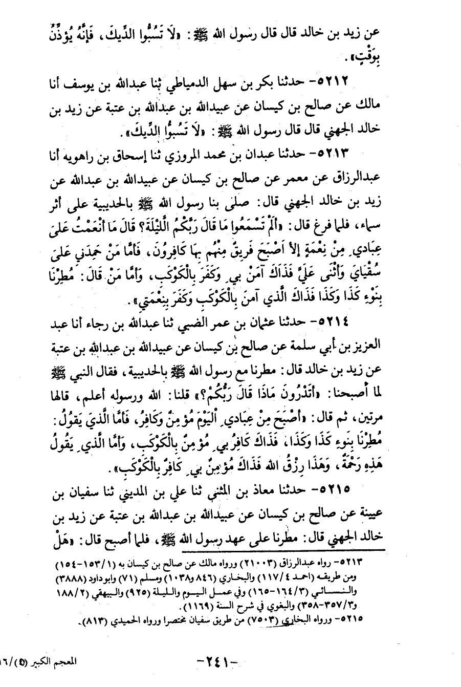 5215 - حَدَّثَنَا مُعَاذُ بْنُ الْمُثَنَّى، ثنا عَلِيُّ بْنُ الْمَدِينِيُّ، ثنا سُفْيَانُ بْنُ عُيَيْنَةَ، عَنْ صَالِحِ بْنِ كَيْسَانَ، عَنْ عُبَيْدِ اللهِ بْنِ عَبْدِ اللهِ بْنِ عُتْبَةَ، عَنْ زَيْدِ بْنِ خَالِدٍ الْجُهَنِيِّ، قَالَ: مُطِرْنَا عَلَى عَهْدِ رَسُولِ اللهِ صَلَّى اللهُ عَلَيْهِ وَسَلَّمَ، فَلَمَّا أَصْبَحَ قَالَ: " هَلْ تَدْرُونَ مَاذَا قَالَ رَبُّكُمُ اللَّيْلَةَ؟ قَالَ: §مَا أَنْعَمْتُ عَلَى عِبَادِي مِنْ نِعْمَةٍ إِلَّا أَصْبَحَ فَرِيقٌ مِنْهُمْ بِهَا كَافِرُونَ يَقُولُونَ: مُطِرْنَا بِنَوْءِ كَذَا وَكَذَا، وَأَمَّا مَنْ آمَنَ بِي وَحَمِدَنِي عَلَى سُقْيَايَ فَذَاكَ الَّذِي آمَنَ بِي وَكَفَرَ بِالْكَوْكَبِ، وَأَمَّا مَنْ قَالَ: مُطِرْنَا بِنَوْءِ كَذَا وَكَذَا فَذَاكَ الَّذِي آمَنَ بِالْكَوْكَبِ وَكَفَرَ بِي "