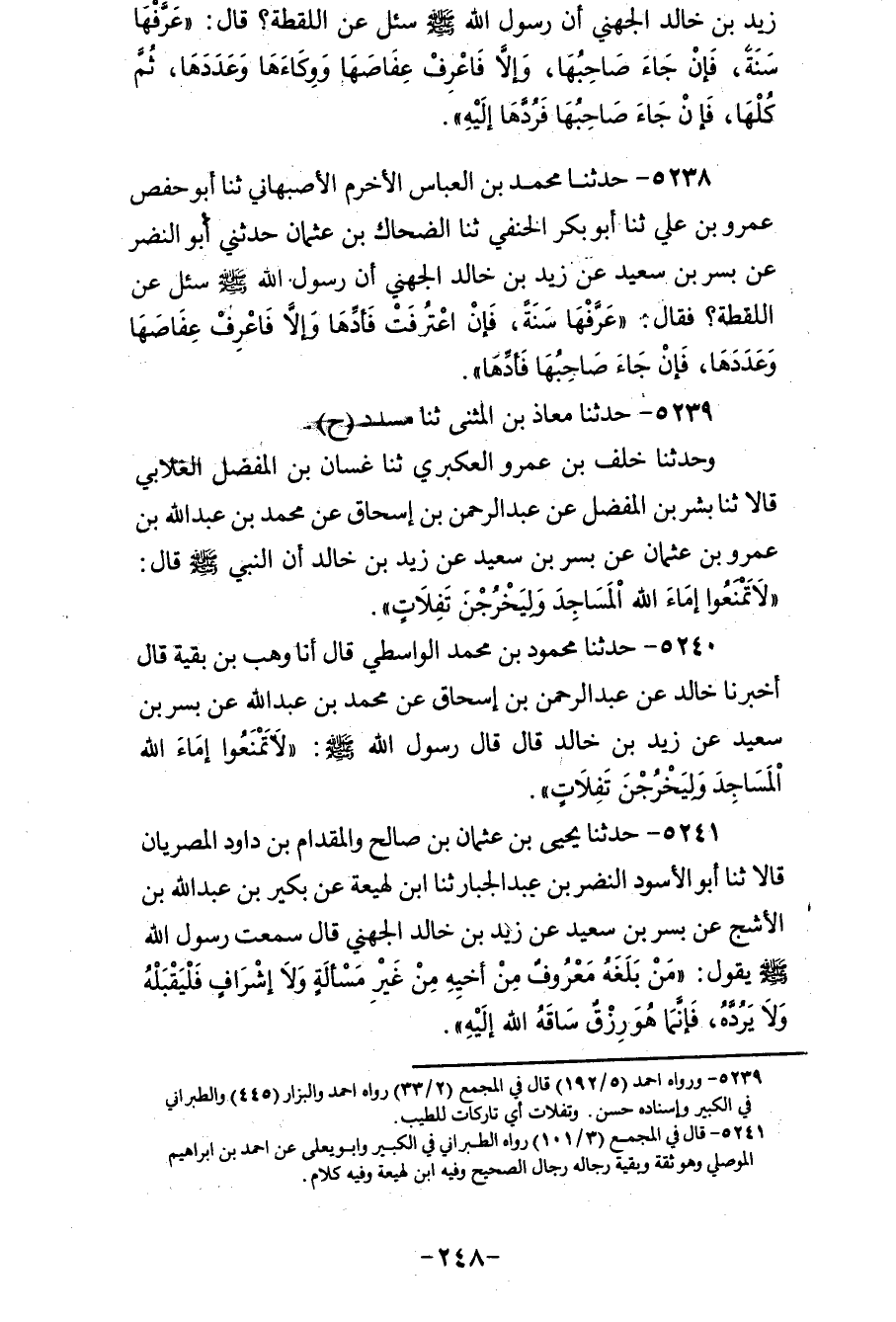 5238 - حَدَّثَنَا مُحَمَّدُ بْنُ الْعَبَّاسِ الْأَخْرَمُ الْأَصْبَهَانِيُّ، ثنا أَبُو حَفْصٍ عَمْرُو بْنُ عَلِيٍّ، ثنا أَبُو بَكْرٍ الْحَنَفِيُّ، ثنا الضَّحَّاكُ بْنُ عُثْمَانَ، حَدَّثَنِي أَبُو النَّضْرِ، عَنْ بُسْرِ بْنِ سَعِيدٍ، عَنْ زَيْدِ بْنِ خَالِدٍ الْجُهَنِيِّ، أَنَّ رَسُولَ اللهِ صَلَّى اللهُ عَلَيْهِ وَسَلَّمَ سُئِلَ §عَنِ اللُّقَطَةِ؟ فَقَالَ: «عَرِّفْهَا سَنَةً، فَإِنِ اعْتُرِفَتْ فَأَدِّهَا وَإِلَّا فَاعْرِفْ عِفَاصَهَا وَعَدَدَهَا، فَإِنْ جَاءَ صَاحِبُهَا فَأَدِّهَا»