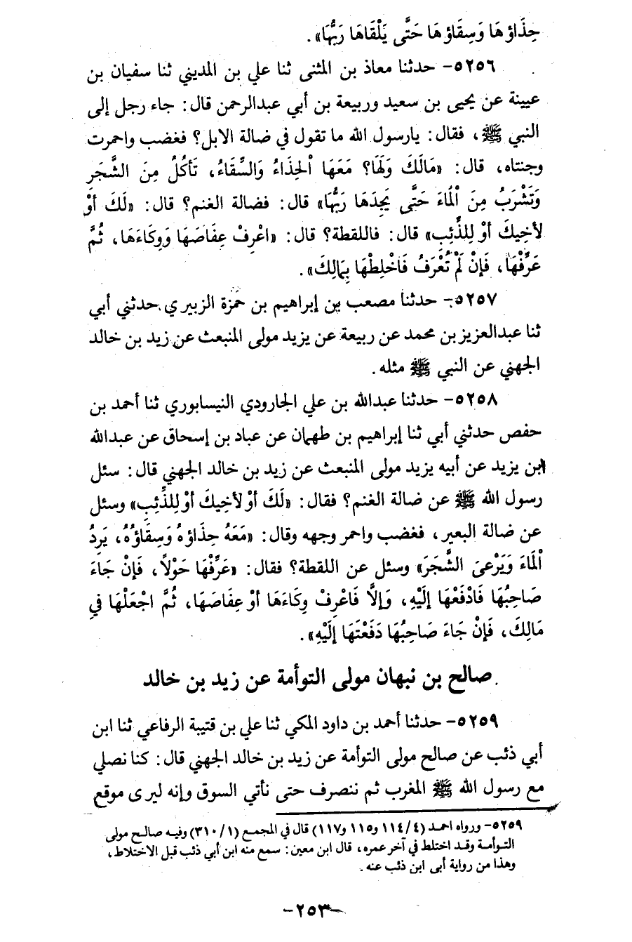 5256 - حَدَّثَنَا مُعَاذُ بْنُ الْمُثَنَّى، ثنا عَلِيُّ بْنُ الْمَدِينِيُّ، ثنا سُفْيَانُ بْنُ عُيَيْنَةَ، عَنْ يَحْيَى بْنِ سَعِيدٍ، وَرَبِيعَةَ بْنِ أَبِي عَبْدِ الرَّحْمَنِ، قَالَ: جَاءَ رَجُلٌ إِلَى النَّبِيِّ صَلَّى اللهُ عَلَيْهِ وَسَلَّمَ فَقَالَ: يَا رَسُولَ اللهِ، §مَا تَقُولُ فِي ضَالَّةِ الْإِبِلِ؟ فَغَضِبَ وَاحْمَرَّتْ وَجْنَتَاهُ، قَالَ: «مَا لَكَ وَلَهَا؟ مَعَهَا الْحِذَاءُ وَالسِّقَاءُ، تَأْكُلُ مِنَ الشَّجَرِ وَتُشْرَبُ مِنَ الْمَاءِ، حَتَّى يَجِدَهَا رَبُّهَا»