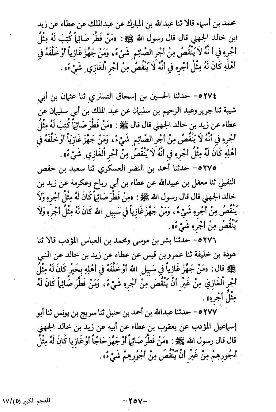 5277 - حَدَّثَنَا عَبْدُ اللهِ بْنُ أَحْمَدَ بْنِ حَنْبَلٍ، ثنا سُرَيْجُ بْنُ يُونُسَ، ثنا أَبُو إِسْمَاعِيلَ الْمُؤَدِّبُ، عَنْ يَعْقُوبَ بْنِ عَطَاءٍ، عَنْ أَبِيهِ، عَنْ زَيْدِ بْنِ خَالِدٍ الْجُهَنِيِّ، قَالَ: قَالَ رَسُولُ اللهِ صَلَّى اللهُ عَلَيْهِ وَسَلَّمَ: «§مَنْ فَطَّرَ صَائِمًا أَوْ جَهَّزَ حَاجًّا أَوْ غَازِيًا كَانَ لَهُ مِثْلُ أُجُورِهِمْ مِنْ غَيْرِ أَنْ يَنْقُصَ مِنْ أُجُورِهِمْ شَيْءٌ»