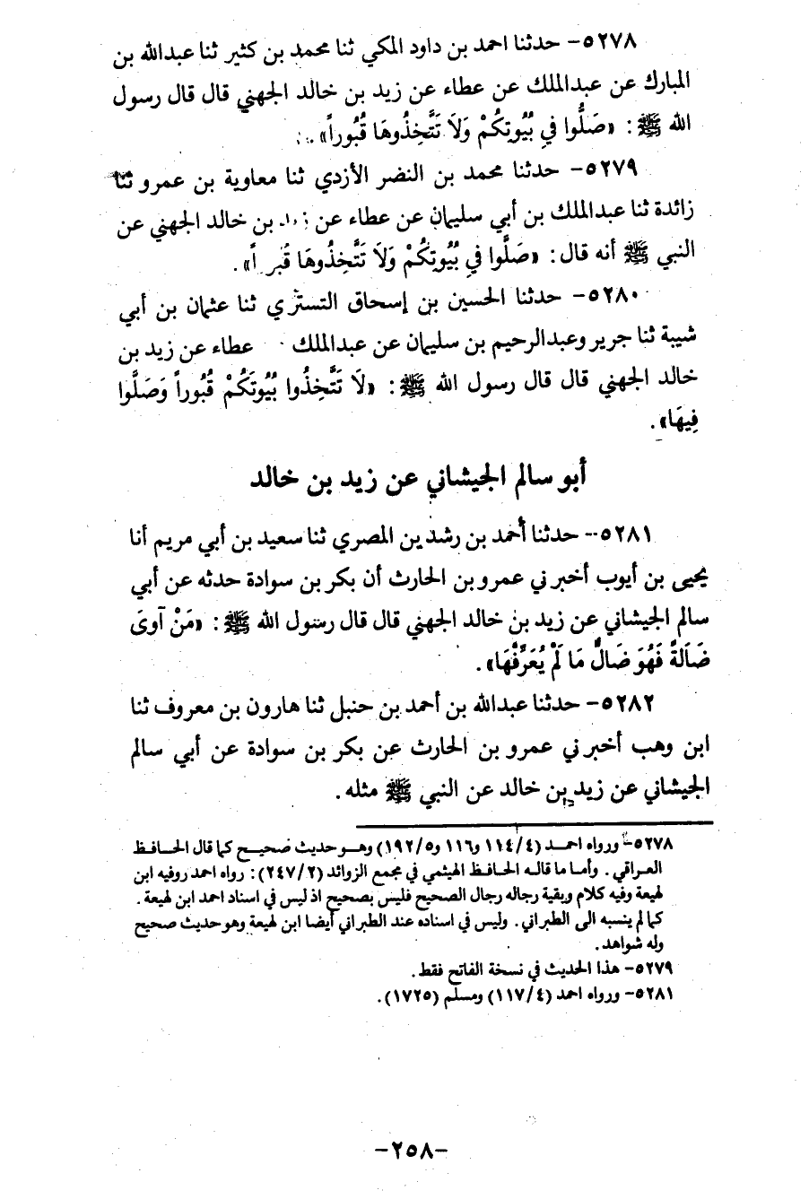 5280 - حَدَّثَنَا الْحُسَيْنُ بْنُ إِسْحَاقَ التُّسْتَرِيُّ، ثنا عُثْمَانُ بْنُ أَبِي شَيْبَةَ، ثنا جَرِيرٌ، وَعَبْدُ الرَّحِيمِ بْنُ سُلَيْمَانَ، عَنْ عَبْدِ الْمَلِكِ، عَنْ عَطَاءٍ، عَنْ زَيْدِ بْنِ خَالِدٍ الْجُهَنِيِّ، قَالَ: قَالَ رَسُولُ اللهِ صَلَّى اللهُ عَلَيْهِ وَسَلَّمَ: «§لَا تَتَّخِذُوا بُيُوتِكُمْ قُبُورًا وَصَلُّوا فِيهَا»