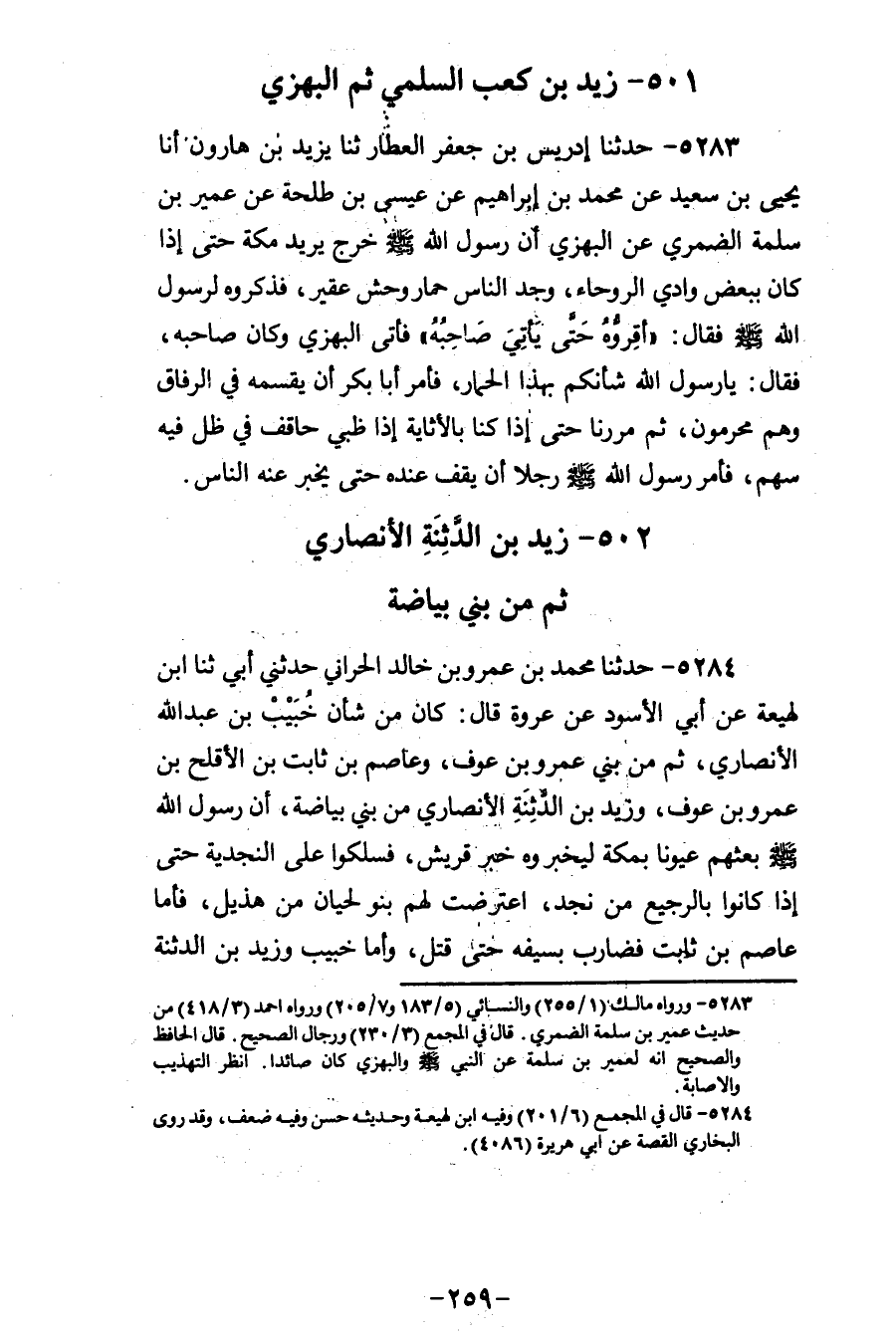 5284 - حَدَّثَنَا مُحَمَّدُ بْنُ عَمْرِو بْنِ خَالِدٍ الْحَرَّانِيُّ، حَدَّثَنِي أَبِي، ثنا ابْنُ لَهِيعَةَ، عَنْ أَبِي الْأَسْوَدِ، عَنْ عُرْوَةَ، قَالَ: " كَانَ مِنْ شَأْنِ خُبَيْبِ بْنِ عَبْدِ اللهِ الْأَنْصَارِيِّ، ثُمَّ مِنْ بَنِي عَمْرِو بْنِ عَوْفٍ، وَعَاصِمِ بْنِ ثَابِتِ بْنِ الْأَفْلَحِ بْنِ عَمْرِو بْنِ عَوْفٍ، وَزَيْدِ بْنِ الدَّثِنَةِ الْأَنْصَارِيِّ، مِنْ بَنِي بَيَاضَةَ، أَنَّ رَسُولَ اللهِ صَلَّى اللهُ عَلَيْهِ وَسَلَّمَ بَعَثَهُمْ عُيُونًا بِمَكَّةَ لِيُخْبِرُوهُ خَبَرَ قُرَيْشٍ، فَسَلَكُوا عَلَى النَّجْدِيَّةِ حَتَّى إِذَا كَانُوا بِالرَّجِيعِ مِنْ نَجْدٍ، اعْتَرَضَتْ لَهُمْ بَنُو لِحْيَانَ مِنْ هُذَيْلٍ، فَأَمَّا عَاصِمُ بْنُ ثَابِتٍ فَضَارَبَ بِسَيْفِهِ حَتَّى قُتِلَ، وَأَمَّا خُبَيْبٌ وَزَيْدُ بْنُ الدَّثِنَةِ -[260]- فَأُصْعِدَا فِي الْجَبَلِ، فَلَمْ يَسْتَطِعْهُمَا الْقَوْمُ حَتَّى جَعَلُوا لَهُمَا الْعُهُودَ وَالْمَوَاثِيقَ فَنَزَلَا إِلَيْهِمْ فَأَوْثَقُوهُمَا رِبَاًطا ثُمَّ أَقْبَلُوا بِهِمَا إِلَى مَكَّةَ فَبَاعُوهُمَا مِنْ قُرَيْشٍ فَأَمَّا خُبَيْبٌ فَاشْتَرَاهُ عُقْبَةُ بْنُ الْحَارِثِ بْنِ نَوْفَلٍ أَخُو حُسَيْنِ بْنِ الْحَارِثِ وَشَرَكَهُ فِي ابْتِيَاعِهِ مَعَهُ أَبُو إِهَابِ بْنُ عَزِيزِ بْنِ قَيْسِ بْنِ سُوَيْدِ بْنِ رَبِيعَةَ بْنِ عَدَسِ بْنِ عَبْدِ اللهِ بْنِ دَارِمٍ وَكَانَ قَيْسُ بْنُ سُوَيْدِ بْنِ رَبِيعَةَ أَخَا عَامِرِ بْنِ نَوْفَلٍ لِأُمِّهِ أُمُّهُمَا بِنْتُ نَهْشَلٍ التَّمِيمِيَّةُ وَعِكْرِمَةُ بْنُ أَبِي جَهْلٍ وَالْأَخْنَسُ بْنُ شُرْنُونَ بْنِ عِلَاجِ بْنِ غُبْرَةَ الثَّقَفِيُّ وَعُبَيْدَةُ بْنُ حَكِيمٍ السُّلَمِيُّ ثُمَّ الذَّكْوَانِيُّ وَأُمَيَّةُ بْنُ عُتْبَةَ بْنِ هَمَّامِ بْنِ حَنْظَلَةَ مِنْ بَنِي دَارِمٍ، وَبَنِي الْحَضْرَمِيِّ وَسَعْيَةُ بْنُ عَبْدِ اللهِ بْنِ أَبِي قَيْسٍ مِنْ بَنِي عَامِرِ بْنِ لُؤَيٍّ، وَصَفْوَانُ بْنُ أُمَيَّةَ بْنِ خَلَفِ بْنِ وَهْبٍ الْجُمَحِيُّ، فَدَفَعُوهُ إِلَى عُقْبَةَ بْنِ الْحَارِثِ، فَسَجَنَهُ عِنْدَهُ فِي دَارٍ، فَمَكَثَ عِنْدَهُ مَا شَاءَ اللهُ أَنْ يَمْكُثَ، وَكَانَتِ امْرَأَةٌ مِنَ آلِ عُقْبَةَ بْنِ الْحَارِثِ بْنِ عَامِرٍ تَفْتَحُ عَنْهُ وَتُطْعِمُهُ، فَقَالَ لَهَا: إِذَا أَرَادَ الْقَوْمُ قَتْلِي فَآذِنِينِي قَبْلَ ذَلِكَ، فَلَمَّا أَرَادُوا قَتْلهُ أَخْبَرَتْهُ، فَقَالَ لَهَا: ابْغِينِي حَدِيدَةً أَسْتَدِفُّ بِهَا - أَيْ أَحْلِقُ عَانَتِي - فَدَخَلَ ابْنُ الْمَرْأَةِ الَّتِي كَانَتْ تَنْجِدُهُ وَالْمُوسَى فِي يَدِهِ، فَأَخَذَ بِيَدِ الْغُلَامِ، فَقَالَ: هَلْ أَمْكَنَ اللهُ مِنْكُمْ؟ فَقَالَتْ: مَا هَذَا ظَنِّي بِكَ، ثُمَّ نَاوَلَهَا الْمُوسَى، فَقَالَ: إِنَّمَا كُنْتُ مَازِحًا، وَخَرَجَ بِهِ الْقَوْمُ الَّذِينَ شَرَكُوا فِيهِ وَخَرَجَ مَعَهُمْ أَهْلُ مْكَّةَ وَخَرَجُوا مَعَهُمْ بِخَشَبَةٍ حَتَّى إِذَا كَانُوا بِالتَّنْعِيمِ نَصَبُوا تِلْكَ الْخَشَبَةَ فَصَلَبُوهُ عَلَيْهَا، وَكَانَ الَّذِي وَلِي قَتْلَهُ عُقْبَةُ بْنُ الْحَارِثِ وَكَانَ أَبُو حُسَيْنٍ صَغِيرًا وَكَانَ مَعَ الْقَوْمِ وَإِنَّمَا قَتَلُوهُ بِالْحَارِثِ بْنِ عَامِرٍ وَكَانَ قُتِلَ يَوْمَ بَدْرٍ كَافِرًا وَقَالَ لَهُمْ خُبَيْبٌ عِنْدَ قَتْلِهِ: أَطْلِقُونِي مِنَ الرِّبَاطِ حَتَّى أَرْكَعَ رَكْعَتَيْنِ فَأَطْلِقُوهُ، فَرَكَعَ رَكْعَتَيْنِ خَفِيفَتَيْنِ، ثُمَّ انْصَرَفَ فَقَالَ: لَوْلَا أَنْ تَظُنُّوا أَنِّي جَزِعٌ مِنَ الْمَوْتِ لَطَوَّلْتُهُمَا فَلِذَلِكَ خَفَّفْتُهُمَا، وَقَالَ: اللُّهُمَّ إِنِّي لَا أَنْظُرُ إِلَّا فِي وَجْهِ عَدُوٍّ اللُّهُمَّ إِنِّي لَا أَجِدُ رَسُولًا إِلَى رَسُولِكَ، فَبَلِّ