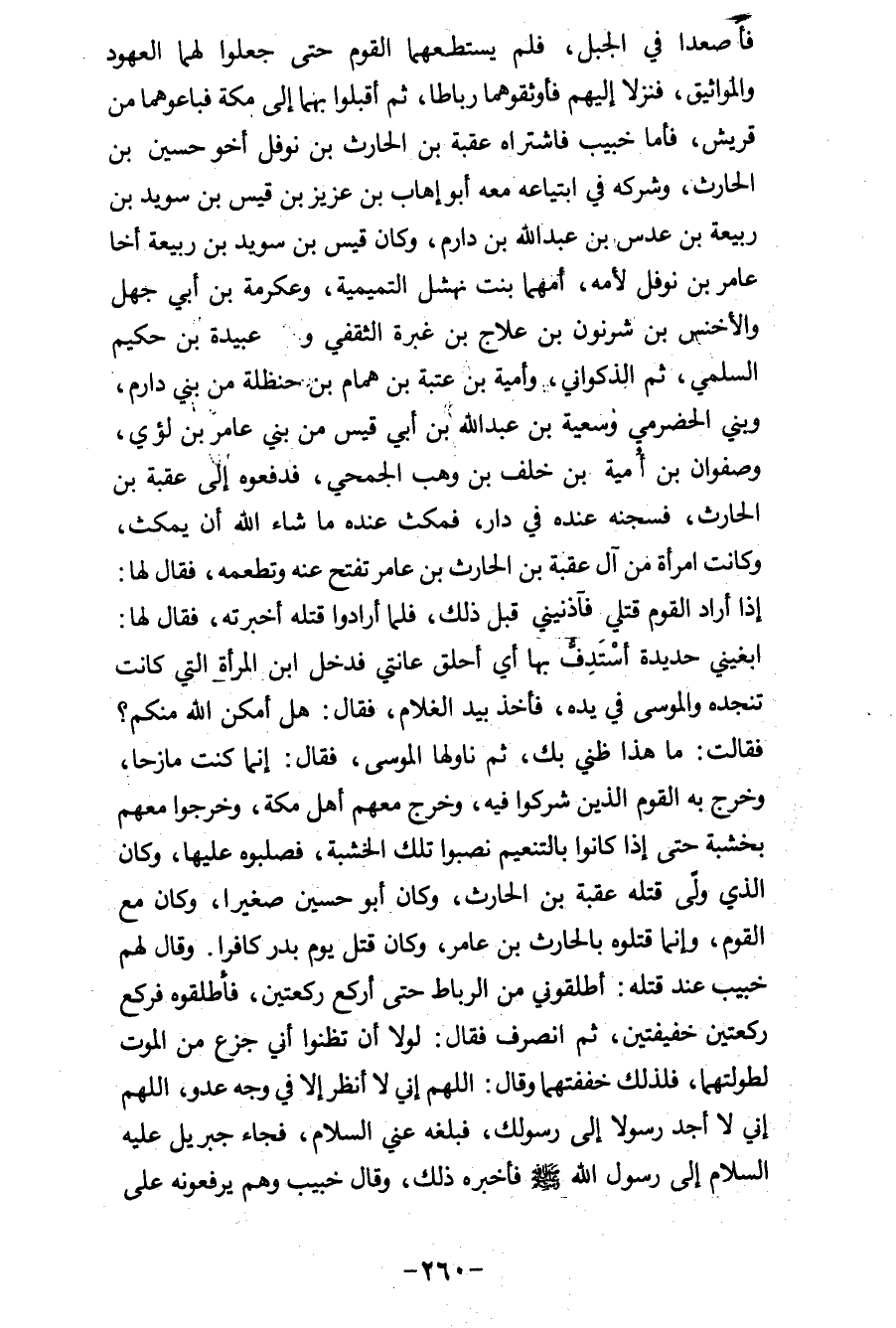 فَلَمْ يَسْتَطِعْهُمَا الْقَوْمُ حَتَّى جَعَلُوا لَهُمَا الْعُهُودَ وَالْمَوَاثِيقَ فَنَزَلاَ إِلَيْهِمْ فَأَوْثَقُوهُمَا رِبَاًطا ثُمَّ أَقْبَلُوا بِهِمَا إِلَى مَكَّةَ فَبَاعُوهُمَا مِنْ قُرَيْشٍ فَأَمَّا خُبَيْبٌ فَاشْتَرَاهُ عُقْبَةُ بْنُ الْحَارِثِ بْنِ نَوْفَلٍ أَخُو حُسَيْنِ بْنِ الْحَارِثِ وَشَرَكَهُ فِي ابْتِيَاعِهِ مَعَهُ أَبُو إِهَابِ بْنُ عَزِيزِ بْنِ قَيْسِ بْنِ سُوَيْدِ بْنِ رَبِيعَةَ بْنِ عَدَسِ بْنِ عَبْدِ اللهِ بْنِ دَارِمٍ وَكَانَ قَيْسُ بْنُ سُوَيْدِ بْنِ رَبِيعَةَ أَخَا عَامِرِ بْنِ نَوْفَلٍ لأُمِّهِ أُمُّهُمَا بِنْتُ نَهْشَلٍ التَّمِيمِيَّةُ وَعِكْرِمَةُ بْنُ أَبِي جَهْلٍ وَالأَخْنَسُ بْنُ شُرْنُونَ بْنِ عِلاَجِ بْنِ غُبْرَةَ الثَّقَفِيُّ وَعُبَيْدَةُ بْنُ حَكِيمٍ السُّلَمِيُّ ثُمَّ الذَّكْوَانِيُّ وَأُمَيَّةُ بْنُ عُتْبَةَ بْنِ هَمَّامِ بْنِ حَنْظَلَةَ مِنْ بَنِي دَارِمٍ ، وَبَنِي الْحَضْرَمِيِّ وَسَعْيَةُ بْنُ عَبْدِ اللهِ بْنِ أَبِي قَيْسٍ مِنْ بَنِي عَامِرِ بْنِ لُؤَيٍّ ، وَصَفْوَانُ بْنُ أُمَيَّةَ بْنِ خَلَفِ بْنِ وَهْبٍ الْجُمَحِيُّ ، فَدَفَعُوهُ إِلَى عُقْبَةَ بْنِ الْحَارِثِ ، فَسَجَنَهُ عِنْدَهُ فِي دَارٍ ، فَمَكَثَ عِنْدَهُ مَا شَاءَ اللَّهُ أَنْ يَمْكُثَ ، وَكَانَتِ امْرَأَةٌ مِنَ آلِ عُقْبَةَ بْنِ الْحَارِثِ بْنِ عَامِرٍ تَفْتَحُ عَنْهُ وَتُطْعِمُهُ ، فَقَالَ لَهَا : إِذَا أَرَادَ الْقَوْمُ قَتْلِي فَآذِنِينِي قَبْلَ ذَلِكَ ، فَلَمَّا أَرَادُوا قَتْلهُ أَخْبَرَتْهُ ، فَقَالَ لَهَا : ابْغِينِي حَدِيدَةً أَسْتَدِفُّ بِهَا - أَيْ أَحْلِقُ عَانَتِي - فَدَخَلَ ابْنُ الْمَرْأَةِ الَّتِي كَانَتْ تَنْجِدُهُ وَالْمُوسَى فِي يَدِهِ ، فَأَخَذَ بِيَدِ الْغُلاَمِ ، فَقَالَ : هَلْ أَمْكَنَ اللَّهُ مِنْكُمْ ؟ فَقَالَتْ : مَا هَذَا ظَنِّي بِكَ ، ثُمَّ نَاوَلَهَا الْمُوسَى ، فَقَالَ : إِنَّمَا كُنْتُ مَازِحًا ، وَخَرَجَ بِهِ الْقَوْمُ الَّذِينَ شَرَكُوا فِيهِ وَخَرَجَ مَعَهُمْ أَهْلُ مْكَّةَ وَخَرَجُوا مَعَهُمْ بِخَشَبَةٍ حَتَّى إِذَا كَانُوا بِالتَّنْعِيمِ نَصَبُوا تِلْكَ الْخَشَبَةَ فَصَلَبُوهُ عَلَيْهَا ، وَكَانَ الَّذِي وَلِي قَتْلَهُ عُقْبَةُ بْنُ الْحَارِثِ وَكَانَ أَبُو حُسَيْنٍ صَغِيرًا وَكَانَ مَعَ الْقَوْمِ وَإِنَّمَا قَتَلُوهُ بِالْحَارِثِ بْنِ عَامِرٍ وَكَانَ قُتِلَ يَوْمَ بَدْرٍ كَافِرًا وَقَالَ لَهُمْ خُبَيْبٌ عِنْدَ قَتْلِهِ : أَطْلِقُونِي مِنَ الرِّبَاطِ حَتَّى أَرْكَعَ رَكْعَتَيْنِ فَأَطْلِقُوهُ ، فَرَكَعَ رَكْعَتَيْنِ خَفِيفَتَيْنِ ، ثُمَّ انْصَرَفَ فَقَالَ : لَوْلاَ أَنْ تَظُنُّوا أَنِّي جَزِعٌ مِنَ الْمَوْتِ لَطَوَّلْتُهُمَا فَلِذَلِكَ خَفَّفْتُهُمَا ، وَقَالَ : اللُّهُمَّ إِنِّي لاَ أَنْظُرُ إِلاَّ فِي وَجْهِ عَدُوٍّ اللُّهُمَّ إِنِّي لاَ أَجِدُ رَسُولاً إِلَى رَسُولِكَ ، فَبَلِّغْهُ عَنِّي السَّلاَمَ ، فَجَاءَ جِبْرِيلُ عَلَيْهِ السَّلاَمُ إِلَى رَسُولِ اللهِ صَلَّى اللَّهُ عَلَيْهِ وَسَلَّمَ فَأَخْبَرَهُ ذَلِكَ ،