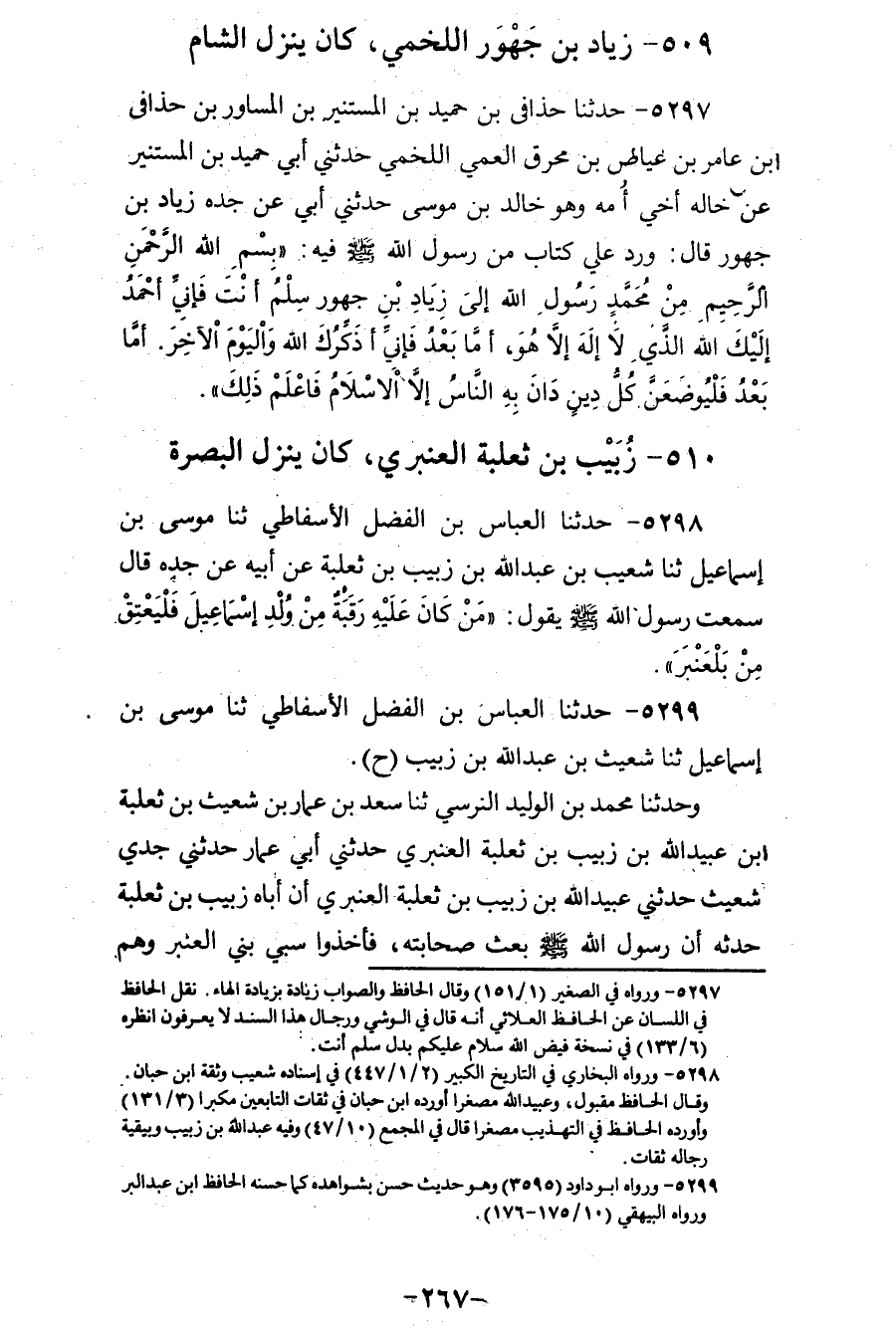 5297 - حَدَّثَنَا حُذَافِيُّ بْنُ حُمَيْدِ بْنِ الْمُسْتَنِيرِ بْنِ الْمُسَاوِرِ بْنِ حُذَافِيِّ بْنِ عَامِرِ بْنِ عِيَاضِ بْنِ مُحْرَقٍ الْعَمِّيِّ اللَّخْمِيُّ، حَدَّثَنِي أَبِي حُمَيْدُ بْنُ الْمُسْتَنِيرِ، عَنْ خَالِهِ أَخِي أُمِّهِ وَهُوَ خَالِدُ بْنُ مُوسَى، حَدَّثَنِي أَبِي، عَنْ جَدِّهِ زِيَادِ بْنِ جَهْوَرٍ قَالَ: وَرَدَ عَلَيَّ كِتَابٌ مِنْ رَسُولِ اللهِ صَلَّى اللهُ عَلَيْهِ وَسَلَّمَ فِيهِ: «§بِسْمِ اللهِ الرَّحْمَنِ الرَّحِيمِ مِنْ مُحَمَّدٍ رَسُولِ اللهِ إِلَى زِيَادِ بْنِ جَهْوَرٍ سَلِّمْ أَنْتَ فَإِنِّي أَحْمَدُ إِلَيْكَ اللهَ الَّذِي لَا إِلَهَ إِلَّا هُوَ، أَمَا بَعْدُ فَإِنِّي أُذَكِّرُكَ اللهَ وَالْيَوْمَ الْآخِرَ. أَمَا بَعْدُ فَلْيُوضَعَنَّ كُلُّ دِينٍ دَانَ بِهِ النَّاسُ إِلَّا الْإِسْلَامَ فَاعْلَمْ ذَلِكُ»