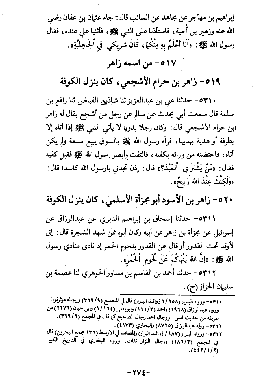 5310 - حَدَّثَنَا عَلِيُّ بْنُ عَبْدِ الْعَزِيزِ، ثنا شَاذُّ بْنُ الْفَيَّاضِ، ثنا رَافِعُ بْنُ سَلَمَةَ، قَالَ: سَمِعْتُ أَبِي يُحَدِّثُ، عَنْ سَالِمٍ، عَنْ رَجُلٍ مِنْ أَشْجَعَ، يُقَالُ لَهُ زَاهِرُ بْنُ حَرَامٍ الْأَشْجَعِيُّ، قَالَ: وَكَانَ رَجُلًا بَدَوِيًّا لَا يَأْتِي النَّبِيُّ صَلَّى اللهُ عَلَيْهِ وَسَلَّمَ إِذَا أَتَاهُ إِلَّا بِطُرْفَةٍ أَوْ هَدِيَّةٍ يُهْدِيَهَا، فَرَآهُ رَسُولُ اللهِ صَلَّى اللهُ عَلَيْهِ وَسَلَّمَ بِالسُّوقِ يَبِيعُ سِلْعَةً وَلَمْ يَكُنْ أَتَاهُ فَاحْتَضَنَهُ مِنْ وَرَائِهِ بِكَفَّيْهِ، فَالْتَفَتَ وَأَبْصَرَ رَسُولَ اللهِ صَلَّى اللهُ عَلَيْهِ وَسَلَّمَ فَقَبَّلَ كَفَّيْهِ فَقَالَ: «§مَنْ يَشْتَرِي الْعَبْدَ؟» قَالَ: إِذَنْ تَجِدُنِي يَا رَسُولَ اللهِ كَاسِدًا، قَالَ: «وَلَكِنَّكَ عِنْدَ اللهِ رَبِيحٌ»