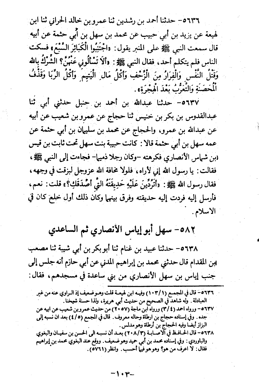 5636 - حَدَّثَنَا أَحْمَدُ بْنُ رِشْدِينَ، ثنا عَمْرُو بْنُ خَالِدٍ الْحَرَّانِيُّ، ثنا ابْنُ لَهِيعَةَ، عَنْ يَزِيدَ بْنِ أَبِي حَبِيبٍ، عَنْ مُحَمَّدِ بْنِ سَهْلِ بْنِ أَبِي حَثْمَةَ، عَنْ أَبِيهِ قَالَ: سَمِعْتُ النَّبِيَّ صَلَّى اللهُ عَلَيْهِ وَسَلَّمَ عَلَى الْمِنْبَرِ يَقُولُ: «§اجْتَنِبُوا الْكَبَائِرَ السَّبْعَ» ، فَسَكَتَ النَّاسُ فَلَمْ يَتَكَلَّمْ أَحَدٌ، فَقَالَ النَّبِيُّ صَلَّى اللهُ عَلَيْهِ وَسَلَّمَ: «أَلَا تَسْأَلُونِي عَنْهُنَّ؟ الشِّرْكُ بِاللهِ، وَقَتْلُ النَّفْسِ، وَالْفِرَارُ مِنَ الزَّحْفِ، وَأَكَلُ مَالِ الْيَتِيمِ، وَأَكَلُ الرِّبَا، وَقَذْفُ الْمُحْصَنَةِ، وَالتَّعَرُّبُ بَعْدَ الْهِجْرَةِ»