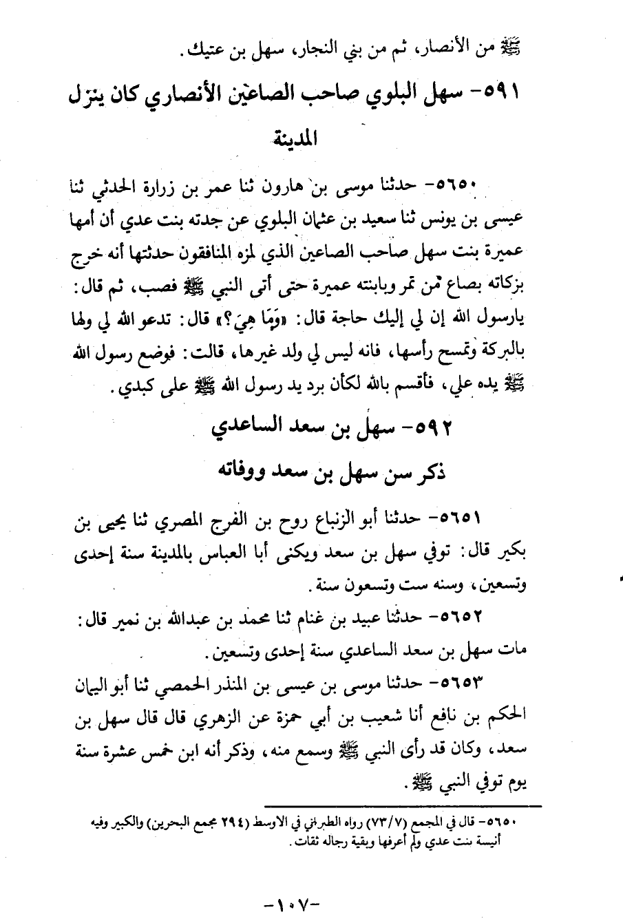 5652 - حَدَّثَنَا عُبَيْدُ بْنُ غَنَّامٍ، ثنا مُحَمَّدُ بْنُ عَبْدِ اللهِ بْنِ نُمَيْرٍ قَالَ: «§مَاتَ سَهْلُ بْنُ سَعْدٍ السَّاعِدِيُّ سَنَةَ إِحْدَى وَتِسْعِينَ»