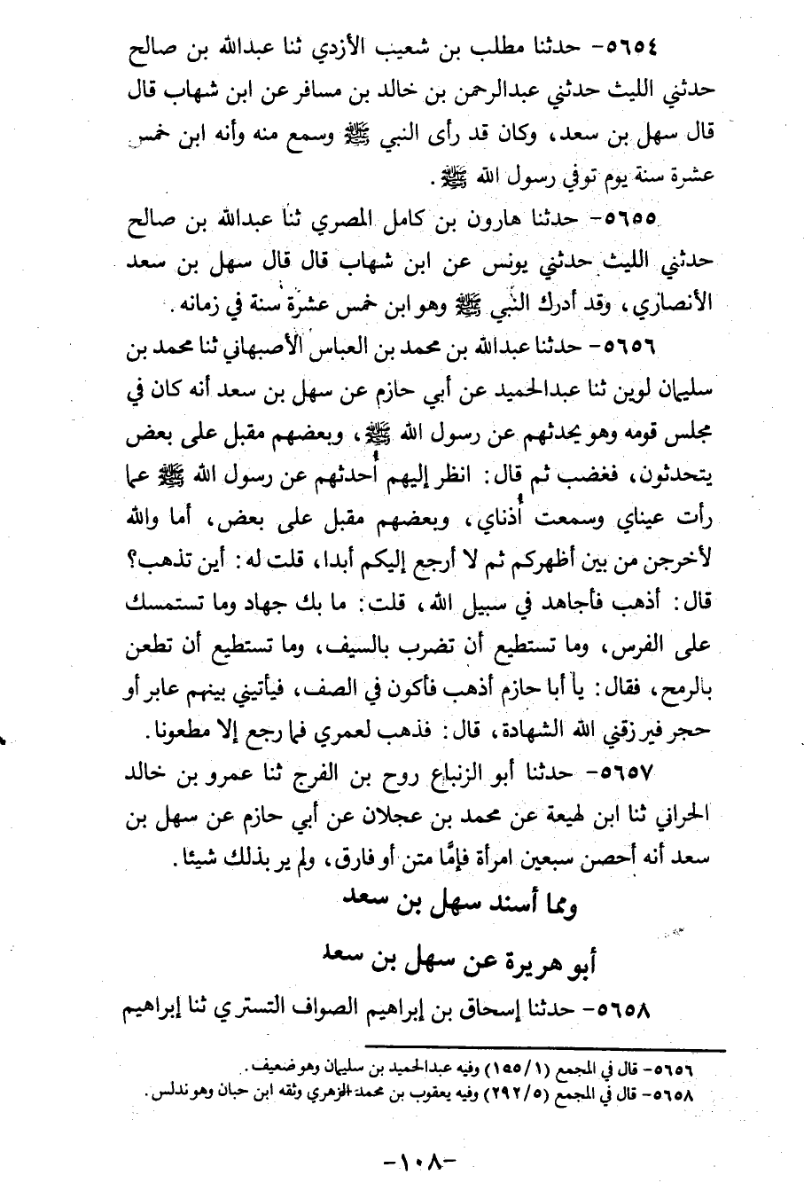 5654 - حَدَّثَنَا مُطَّلِبُ بْنُ شُعَيْبٍ الْأَزْدِيُّ، ثنا عَبْدُ اللهِ بْنُ صَالِحٍ، حَدَّثَنِي اللَّيْثُ، حَدَّثَنِي عَبْدُ الرَّحْمَنِ بْنُ خَالِدِ بْنِ مُسَافِرٍ، عَنِ ابْنِ شِهَابٍ قَالَ: قَالَ سَهْلُ بْنُ سَعْدٍ، «وَكَانَ قَدْ §رَأَى النَّبِيَّ صَلَّى اللهُ عَلَيْهِ وَسَلَّمَ وَسَمِعَ مِنْهُ، وَأَنَّهُ ابْنُ خَمْسَ عَشْرَةَ سَنَةً يَوْمَ تُوُفِّيَ رَسُولُ اللهِ صَلَّى اللهُ عَلَيْهِ وَسَلَّمَ»