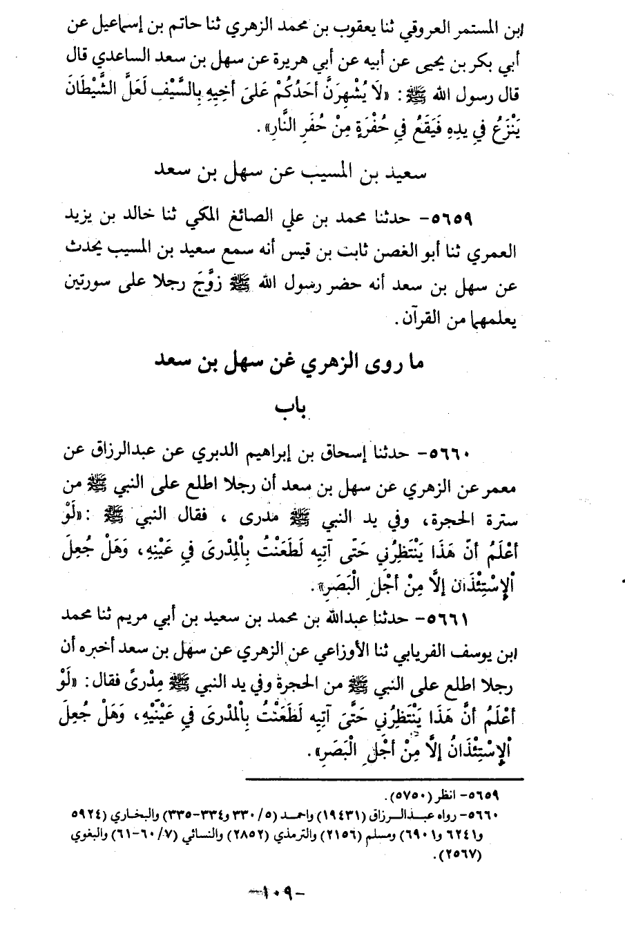 5661 - حَدَّثَنَا عَبْدُ اللهِ بْنُ مُحَمَّدِ بْنِ سَعِيدِ بْنِ أَبِي مَرْيَمَ، ثنا مُحَمَّدُ بْنُ يُوسُفَ الْفِرْيَابِيُّ، ثنا الْأَوْزَاعِيُّ، عَنِ الزُّهْرِيِّ، عَنْ سَهْلِ بْنِ سَعْدٍ، أَخْبَرَهُ أَنَّ رَجُلًا اطَّلَعَ عَلَى النَّبِيِّ صَلَّى اللهُ عَلَيْهِ وَسَلَّمَ مِنَ الْحُجْرَةِ، وَفِي يَدِ النَّبِيِّ صَلَّى اللهُ عَلَيْهِ وَسَلَّمَ مِدْرًى، فَقَالَ: «§لَوْ أَعْلَمُ أَنَّ هَذَا يَنْتَظِرُنِي حَتَّى آتِيَهُ، لَطَعَنْتُ بِالْمِدْرَى فِي عَيْنَيْهِ، وَهَلْ جُعِلَ الِاسْتِئْذَانُ إِلَّا مِنْ أَجْلِ الْبَصَرِ»