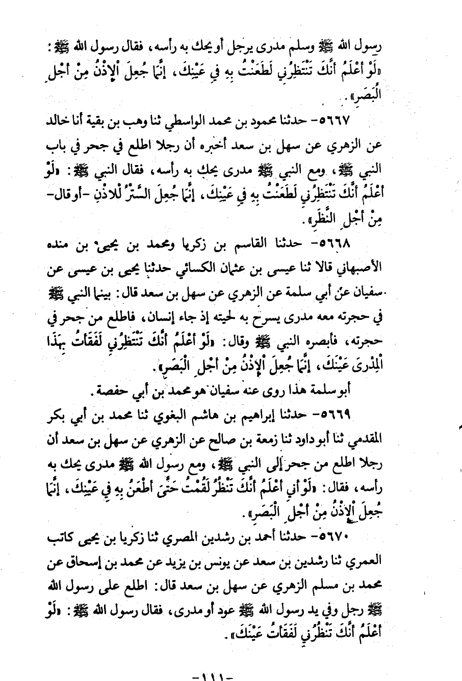 5668 - حَدَّثَنَا الْقَاسِمُ بْنُ زَكَرِيَّا وَمُحَمَّدُ بْنُ يَحْيَى بْنِ مَنْدَهِ الْأَصْبَهَانِيُّ، قَالَا: ثنا عِيسَى بْنُ عُثْمَانَ الْكِسَائِيُّ، حَدَّثَنَا يَحْيَى بْنُ عِيسَى، عَنْ سُفْيَانَ، عَنْ أَبِي سَلَمَةَ، عَنِ الزُّهْرِيِّ، عَنْ سَهْلِ بْنِ سَعْدٍ قَالَ: بَيْنَمَا النَّبِيُّ صَلَّى اللهُ عَلَيْهِ وَسَلَّمَ فِي حُجْرَتِهِ مَعَهُ مِدْرًى، يُسَرِّحُ بِهِ لِحْيَتَهُ، إِذْ جَاءَ إِنْسَانٌ فَاطَّلَعَ مِنْ جُحْرٍ فِي حُجْرَتِهِ، فَأَبْصَرَهُ النَّبِيُّ صَلَّى اللهُ عَلَيْهِ وَسَلَّمَ، وَقَالَ: «§لَوْ أَعْلَمُ أَنَّكَ تَنْتَظِرُنِي، لَفَقَأْتُ بِهَذَا الْمِدْرَى عَيْنَكَ، إِنَّمَا جُعِلَ الْإِذْنُ مِنْ أَجْلِ الْبَصَرِ» ، " أَبُو سَلَمَةَ هَذَا رَوَى عَنْهُ سُفْيَانُ هُوَ: مُحَمَّدُ بْنُ أَبِي حَفْصَةَ "