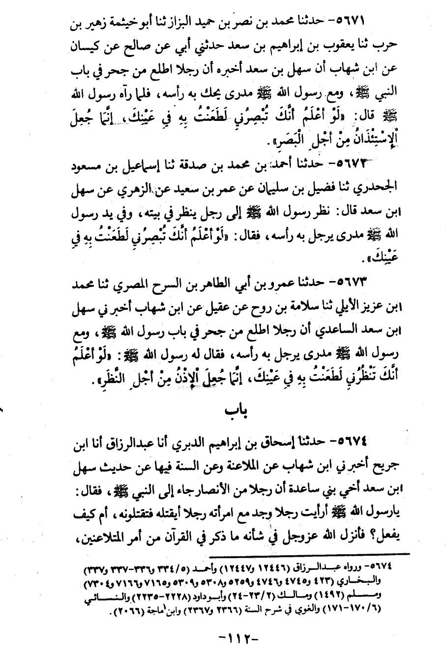 5671 - حَدَّثَنَا مُحَمَّدُ بْنُ نَصْرِ بْنِ حُمَيْدٍ الْبَزَّازُ، ثنا أَبُو خَيْثَمَةَ زُهَيْرُ بْنُ حَرْبٍ، ثنا يَعْقُوبُ بْنُ إِبْرَاهِيمَ بْنِ سَعْدٍ، حَدَّثَنِي أَبِي، عَنْ صَالِحِ بْنِ كَيْسَانَ، عَنِ ابْنِ شِهَابٍ، أَنَّ سَهْلَ بْنَ سَعْدٍ أَخْبَرَهُ، أَنَّ رَجُلًا اطَّلَعَ مِنْ جُحْرٍ فِي بَابِ النَّبِيِّ صَلَّى اللهُ عَلَيْهِ وَسَلَّمَ، وَمَعَ رَسُولِ اللهِ صَلَّى اللهُ عَلَيْهِ وَسَلَّمَ مِدْرًى يَحُكُّ بِهِ رَأْسَهُ، فَلَمَّا رَآهُ رَسُولُ اللهِ صَلَّى اللهُ عَلَيْهِ وَسَلَّمَ قَالَ: «§لَوْ أَعْلَمُ أَنَّكَ تُبْصِرُنِي، لَطَعَنْتُ بِهِ فِي عَيْنِكَ، إِنَّمَا جُعِلَ الِاسْتِئْذَانُ مِنْ أَجْلِ الْبَصَرِ»
