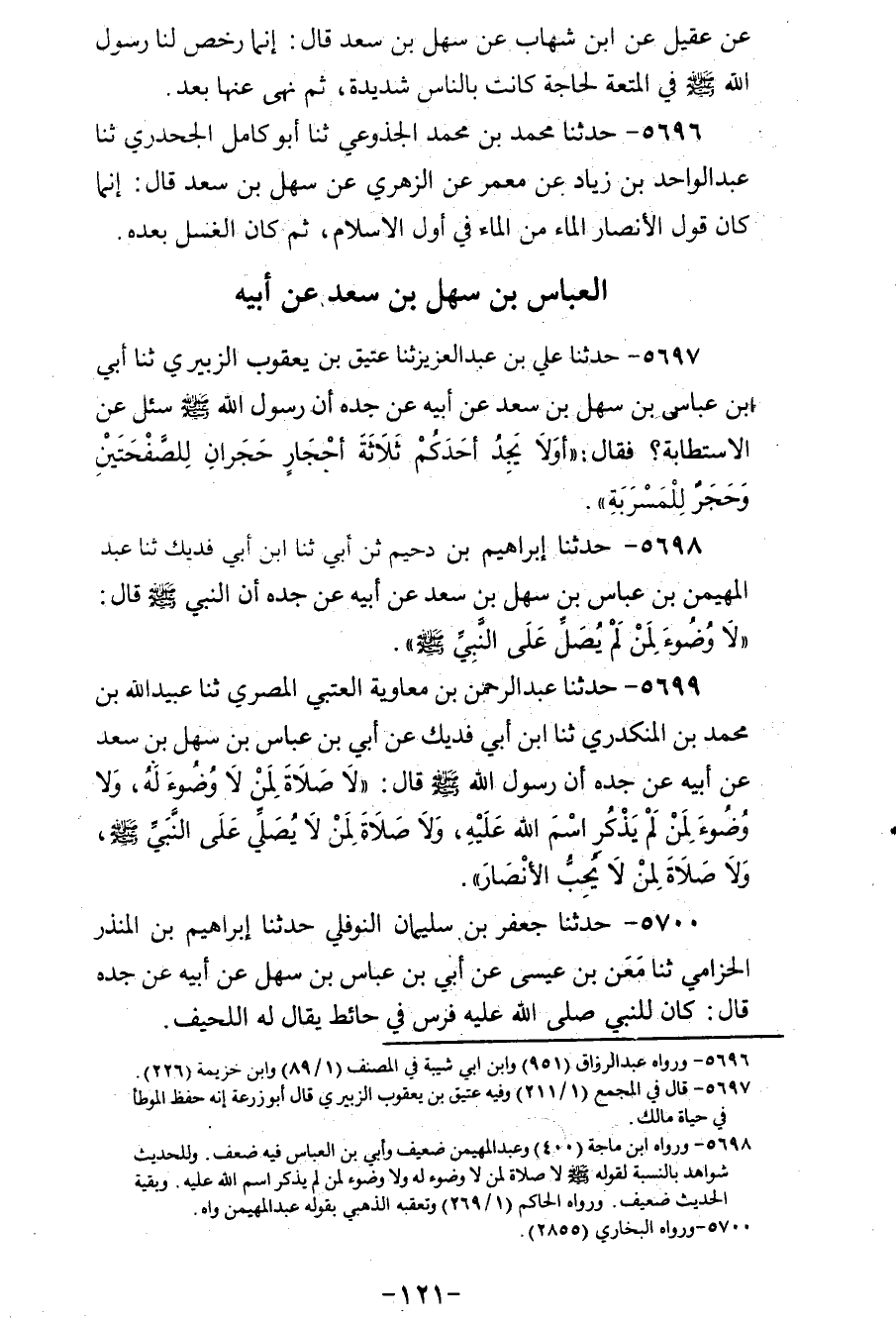 5699 - حَدَّثَنَا عَبْدُ الرَّحْمَنِ بْنِ مُعَاوِيَةَ الْعُتْبِيُّ الْمِصْرِيُّ، ثنا عُبَيْدُ اللهِ بْنُ مُحَمَّدِ بْنِ الْمُنْكَدِرِيِّ، ثنا ابْنُ أَبِي فُدَيْكٍ، عَنْ أُبَيِّ بْنِ عَبَّاسِ بْنِ سَهْلِ بْنِ سَعْدٍ، عَنْ أَبِيهِ، عَنْ جَدِّهِ، أَنَّ رَسُولَ اللهِ صَلَّى اللهُ عَلَيْهِ وَسَلَّمَ قَالَ: «§لَا صَلَاةَ لِمَنْ لَا وُضُوءَ لَهُ، وَلَا وُضُوءَ لِمَنْ لَمْ يَذْكُرِ اسْمَ اللهِ عَلَيْهِ، وَلَا صَلَاةَ لِمَنْ لَا يُصَلِّي عَلَى النَّبِيِّ صَلَّى اللهُ عَلَيْهِ وَسَلَّمَ، وَلَا صَلَاةَ لِمَنْ لَا يُحِبُّ الْأَنْصَارَ»