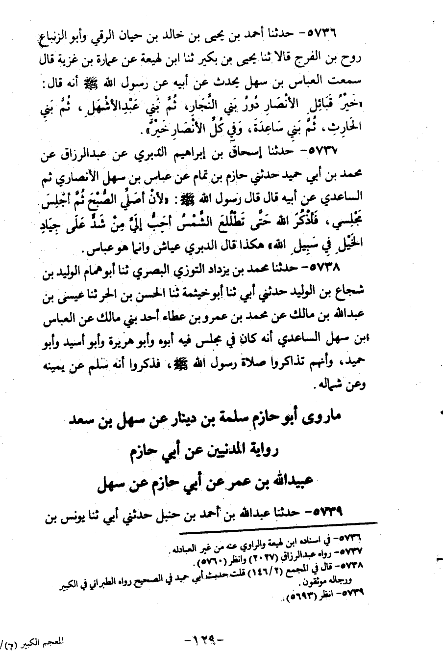 5736 - حَدَّثَنَا أَحْمَدُ بْنُ يَحْيَى بْنِ خَالِدِ بْنِ حَيَّانَ الرَّقِّيُّ، وَأَبُو الزِّنْبَاعِ رَوْحُ بْنُ الْفَرَجِ، قَالَا: ثنا يَحْيَى بْنُ بُكَيْرٍ، ثنا ابْنُ لَهِيعَةَ، عَنْ عُمَارَةَ بْنِ غَزِيَّةَ، قَالَ: سَمِعْتُ الْعَبَّاسَ بْنَ سَهْلٍ، يُحَدِّثُ عَنْ أَبِيهِ، عَنْ رَسُولِ اللهِ صَلَّى اللهُ عَلَيْهِ وَسَلَّمَ أَنَّهُ قَالَ: «§خَيْرُ قَبَائِلِ الْأَنْصَارِ دُورُ بَنِي النَّجَّارِ، ثُمَّ بَنِي عَبْدِ الْأَشْهَلِ، ثُمَّ بَنِي الْحَارِثِ، ثُمَّ بَنِي سَاعِدَةَ، وَفِي كُلِّ الْأَنْصَارِ خَيْرٌ»