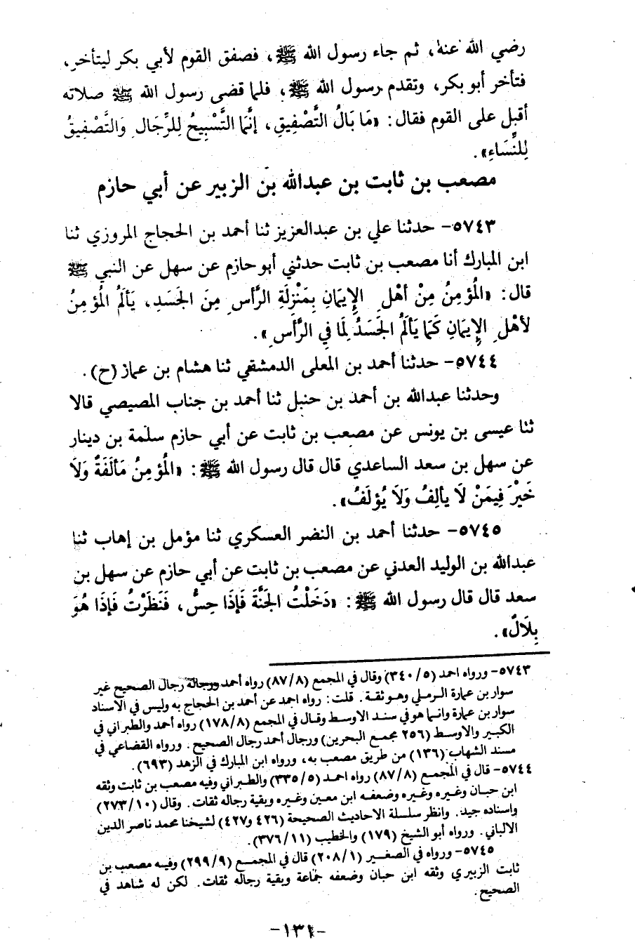 5745 - حَدَّثَنَا أَحْمَدُ بْنُ النَّضْرِ الْعَسْكَرِيُّ، ثنا مُؤَمَّلُ بْنُ إِهَابٍ، ثنا عَبْدُ اللهِ بْنُ الْوَلِيدِ الْعَدَنِيُّ، عَنْ مُصْعَبِ بْنِ ثَابِتٍ، عَنْ أَبِي حَازِمٍ، عَنْ سَهْلِ بْنِ سَعْدٍ قَالَ: قَالَ رَسُولُ اللهِ صَلَّى اللهُ عَلَيْهِ وَسَلَّمَ: «§دَخَلْتُ الْجَنَّةَ، فَإِذَا حَسٌّ فَنَظَرْتُ، فَإِذَا هُوَ بِلَالٌ»