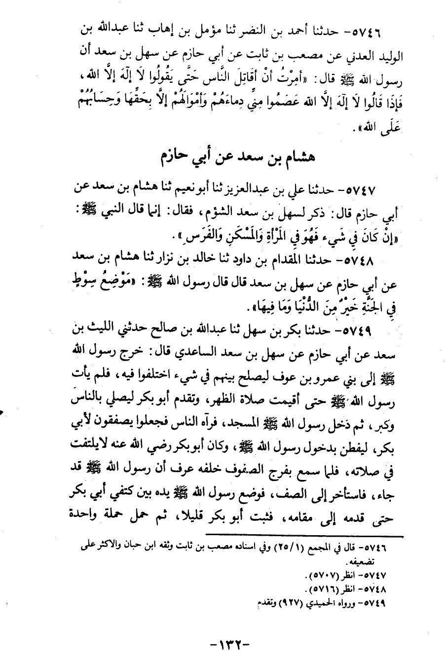 5749 - حَدَّثَنَا بَكْرُ بْنُ سَهْلٍ، ثنا عَبْدُ اللهِ بْنُ صَالِحٍ، حَدَّثَنِي اللَّيْثُ بْنُ سَعْدٍ، عَنْ أَبِي حَازِمٍ، عَنْ سَهْلِ بْنِ سَعْدٍ السَّاعِدِيِّ قَالَ: خَرَجَ رَسُولُ اللهِ صَلَّى اللهُ عَلَيْهِ وَسَلَّمَ إِلَى بَنِي عَمْرِو بْنِ عَوْفٍ، لِيُصْلِحَ بَيْنَهُمْ فِي شَيْءٍ اخْتَلَفُوا فِيهِ، فَلَمْ يَأْتِ رَسُولُ اللهِ صَلَّى اللهُ عَلَيْهِ وَسَلَّمَ حَتَّى أُقِيمَتْ صَلَاةُ الظُّهْرِ، وَتَقَدَّمَ أَبُو بَكْرٍ لِيُصَلِّيَ بِالنَّاسِ وَكَبَّرَ، ثُمَّ دَخَلَ رَسُولُ اللهِ صَلَّى اللهُ عَلَيْهِ وَسَلَّمَ، فَرَآهُ النَّاسُ، فَجَعَلُوا يُصَفِّقُونَ لِأَبِي بَكْرٍ، لِيَفْطِنَ بِدُخُولِ رَسُولِ اللهِ صَلَّى اللهُ عَلَيْهِ وَسَلَّمَ، وَكَانَ أَبُو بَكْرٍ رَضِيَ اللهُ تَعَالَى عَنْهُ لَا يَلْتَفِتُ فِي صَلَاتِهِ، فَلَمَّا سَمِعَ بِفَرْجِ الصُّفُوفِ خَلْفَهُ، عَرَفَ أَنَّ رَسُولَ اللهِ صَلَّى اللهُ عَلَيْهِ وَسَلَّمَ جَاءَ، فَاسْتَأْخَرَ إِلَى الصَّفِّ فَوَضَعَ رَسُولُ اللهِ صَلَّى اللهُ عَلَيْهِ وَسَلَّمَ، بَيْنَ كَتِفَيْ أَبِي بَكْرٍ، حَتَّى قَدَّمَهُ إِلَى مَقَامِهِ، فَثَبَتَ، أَبُو بَكْرٍ قَلِيلًا، ثُمَّ حَمَلَ حَمْلَةً وَاحِدَةً الْقَهْقَرَى، وَدَخَلَ فِي الصَّفِّ، فَلَمَّا رَأَى رَسُولُ اللهِ صَلَّى اللهُ عَلَيْهِ وَسَلَّمَ ذَلِكَ تَقَدَّمَ رَسُولُ اللهِ صَلَّى اللهُ عَلَيْهِ وَسَلَّمَ فَصَلَّى لَهُمْ حَتَّى قَضَى الصَّلَاةَ، ثُمَّ سَلَّمَ فَأَقْبَلَ عَلَى أَبِي بَكْرٍ، فَقَالَ: «مَا حَمَلَكَ يَا أَبَا بَكْرٍ عَلَى مَا صَنَعْتَ، أَلَا ثَبَتَّ حِينَ قَدَّمْتُكَ؟» ، قَالَ: قَدْ أَرَدْتُ ذَلِكَ، ثُمَّ إِنْهُ لَمْ أَرَ أَنَّهُ يَنْبَغِي لِابْنِ أَبِي قُحَافَةَ أَنْ يَتَقَدَّمَ أَمَامَ رَسُولِ اللهِ صَلَّى اللهُ عَلَيْهِ وَسَلَّمَ، ثُمَّ أَقْبَلَ عَلَى النَّاسِ، فَقَالَ: «§إِذَا نَابَتْكُمْ نَائِبَةٌ، فَعَلَيْكُمْ بِالتَّسْبِيحِ، فَإِنَّ التَّسْبِيحَ لِلرِّجَالِ، وَالتَّصْفِيقَ لِلنِّسَاءِ»