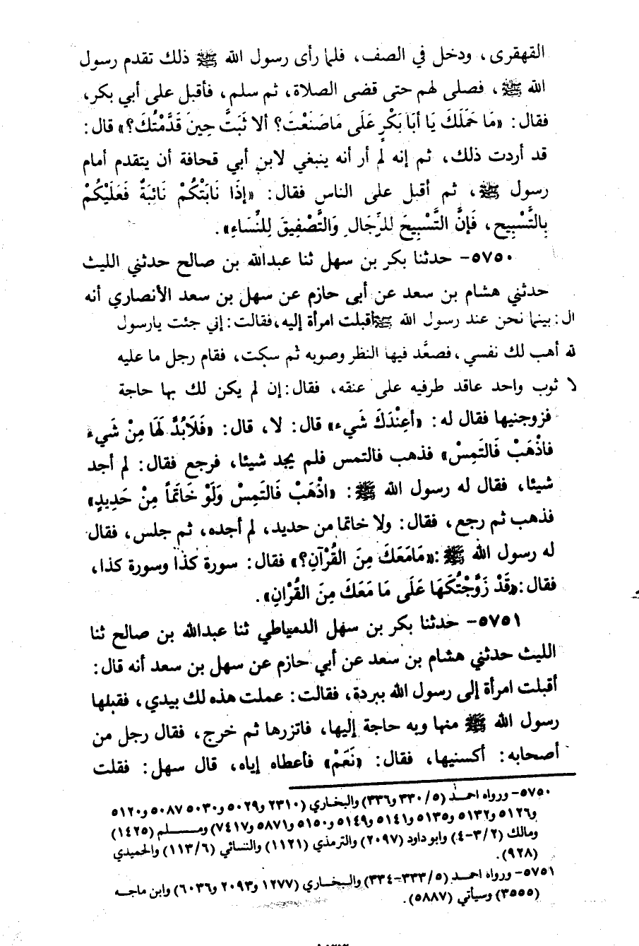 5750 - حَدَّثَنَا بَكْرُ بْنُ سَهْلٍ، ثنا عَبْدُ اللهِ بْنُ صَالِحٍ، حَدَّثَنِي اللَّيْثُ، حَدَّثَنِي هِشَامُ بْنُ سَعْدٍ، عَنْ أَبِي حَازِمٍ، عَنْ سَهْلِ بْنِ سَعْدٍ الْأَنْصَارِيِّ أَنَّهُ قَالَ: بَيْنَمَا نَحْنُ عِنْدَ رَسُولِ اللهِ صَلَّى اللهُ عَلَيْهِ وَسَلَّمَ، أَقْبَلَتِ امْرَأَةٌ إِلَيْهِ، فَقَالَتْ: إِنِّي جِئْتُ يَا رَسُولَ اللهِ أَهَبُ لَكَ نَفْسِي، فَصَعَّدَ فِيهَا النَّظَرَ وَصَوَّبَهُ، ثُمَّ سَكَتَ، فَقَامَ رَجُلٌ مَا عَلَيْهِ إِلَّا ثَوْبٌ وَاحِدٌ، عَاقِدٌ طَرَفَيْهِ عَلَى عُنُقَهِ، فَقَالَ: إِنْ لَمْ يَكُنْ لَكَ بِهَا حَاجَةٌ فَزَوِّجْنِيهَا، فَقَالَ لَهُ: «أَعِنْدَكَ شَيْءٌ؟» ، قَالَ: لَا، قَالَ: «فَلَا بُدَّ لَهَا مِنْ شَيْءٍ، فَاذْهَبْ فَالْتَمِسْ» ، فَذَهَبَ فَالْتَمَسَ، فَلَمْ يَجِدْ شَيْئًا، فَرَجَعَ فَقَالَ: لَمْ أَجِدْ شَيْئًا، فَقَالَ لَهُ رَسُولُ اللهِ صَلَّى اللهُ عَلَيْهِ وَسَلَّمَ: «اذْهَبْ فَالْتَمِسْ وَلَوْ خَاتَمًا مِنْ حَدِيدٍ» ، فَذَهَبَ، ثُمَّ رَجَعَ فَقَالَ: وَلَا خَاتَمًا مِنْ حَدِيدٍ لَمْ أَجِدْهُ، ثُمَّ جَلَسَ، فَقَالَ لَهُ رَسُولُ اللهِ صَلَّى اللهُ عَلَيْهِ وَسَلَّمَ: «مَا مَعَكَ مِنَ الْقُرْآنِ؟» ، فَقَالَ: سُورَةُ كَذَا وَسُورَةُ كَذَا، فَقَالَ: «§قَدْ زَوَّجْتُكَهَا عَلَى مَا مَعَكَ مِنَ الْقُرْآنِ»
