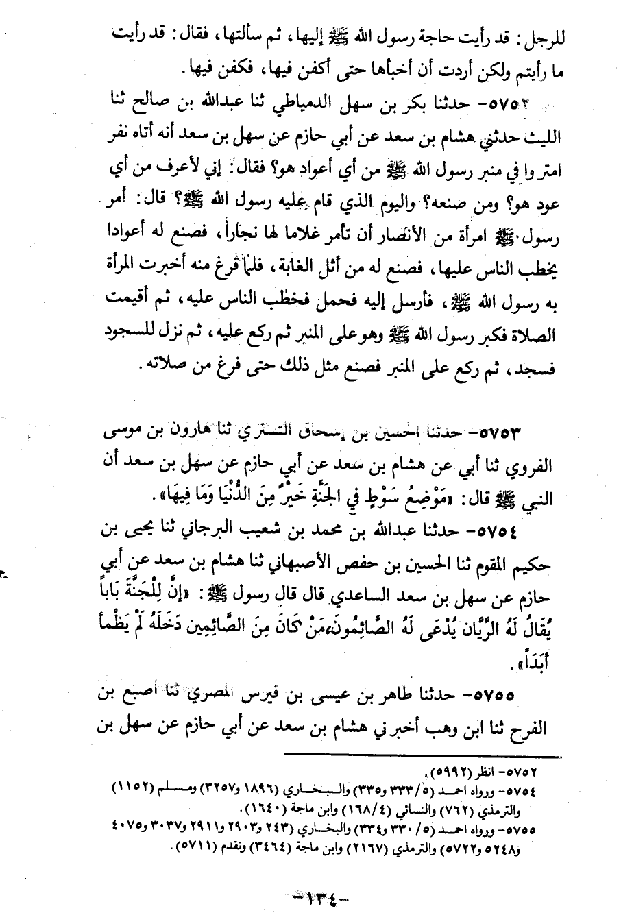 5752 - حَدَّثَنَا بَكْرُ بْنُ سَهْلٍ الدِّمْيَاطِيُّ، ثنا عَبْدُ اللهِ بْنُ صَالِحٍ، ثنا اللَّيْثُ، حَدَّثَنِي هِشَامُ بْنُ سَعْدٍ، عَنْ أَبِي حَازِمٍ، عَنْ سَهْلِ بْنِ سَعْدٍ أَنَّهُ أَتَاهُ نَفَرٌ امْتَرَوْا فِي مِنْبَرِ رَسُولِ اللهِ صَلَّى اللهُ عَلَيْهِ وَسَلَّمَ: مِنْ أَيِّ أَعْوَادٍ هُوَ؟ فَقَالَ: إِنِّي لَأَعْرِفُ مِنْ أَيِّ عُودٍ هُوَ، وَمَنْ صَنَعَهُ، وَالْيَوْمَ الَّذِي قَامَ عَلَيْهِ رَسُولُ اللهِ صَلَّى اللهُ عَلَيْهِ وَسَلَّمَ، قَالَ: «§أَمَرَ رَسُولُ اللهِ صَلَّى اللهُ عَلَيْهِ وَسَلَّمَ امْرأَةً مِنَ الْأَنْصَارِ أَنْ تَأْمُرَ غُلَامًا لَهَا نَجَّارًا، فَصَنَعَ لَهُ أَعْوَادًا يَخْطُبُ النَّاسَ عَلَيْهَا، فَصَنَعَ لَهُ مِنْ أَثْلِ الْغَابَةِ، فَلَمَّا فَرَغَ مِنْهُ، أَخْبَرَتِ الْمَرْأَةُ بِهِ رَسُولَ اللهِ صَلَّى اللهُ عَلَيْهِ وَسَلَّمَ، فَأَرْسَلَ إِلَيْهِ فَحُمِلَ، فَخَطَبَ النَّاسَ عَلَيْهِ، ثُمَّ أُقِيمَتِ الصَّلَاةُ، فَكَبَّرَ رَسُولُ اللهِ صَلَّى اللهُ عَلَيْهِ وَسَلَّمَ وَهُوَ عَلَى الْمِنْبَرِ، ثُمَّ رَكَعَ عَلَيْهِ، ثُمَّ نَزَلَ لِلسُّجُودِ فَسَجَدَ، ثُمَّ رَكَعَ عَلَى الْمِنْبَرِ، فَصَنَعَ مِثْلَ ذَلِكَ حَتَّى فَرَغَ مِنْ صَلَاتِهِ»