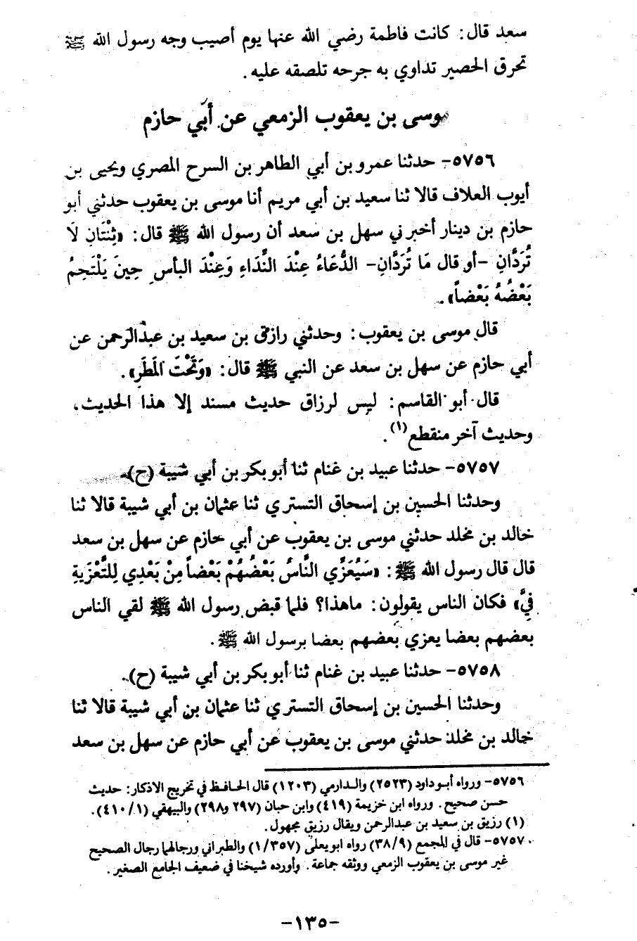 5757 - حَدَّثَنَا عُبَيْدُ بْنُ غَنَّامٍ، ثنا أَبُو بَكْرِ بْنُ أَبِي شَيْبَةَ، ح وَحَدَّثَنَا الْحُسَيْنُ بْنُ إِسْحَاقَ التُّسْتَرِيُّ، ثنا عُثْمَانُ بْنُ أَبِي شَيْبَةَ، قَالَا: ثنا خَالِدُ بْنُ مَخْلَدٍ، حَدَّثَنِي مُوسَى بْنُ يَعْقُوبَ، عَنْ أَبِي حَازِمٍ، عَنْ سَهْلِ بْنِ سَعْدٍ قَالَ: قَالَ رَسُولُ اللهِ صَلَّى اللهُ عَلَيْهِ وَسَلَّمَ: «§سَيُعَزِّي النَّاسُ بَعْضُهُمْ بَعْضًا مِنْ بَعْدِي للتَّعْزِيَةِ فِيَّ» ، فَكَانَ النَّاسُ يَقُولُونَ: مَا هَذَا؟، فَلَمَّا قُبِضَ رَسُولُ اللهِ صَلَّى اللهُ عَلَيْهِ وَسَلَّمَ، لَقِيَ النَّاسُ بَعْضُهُمْ بَعْضًا يُعَزِّي بَعْضُهُمْ بَعْضًا بِرَسُولِ اللهِ صَلَّى اللهُ عَلَيْهِ وَسَلَّمَ