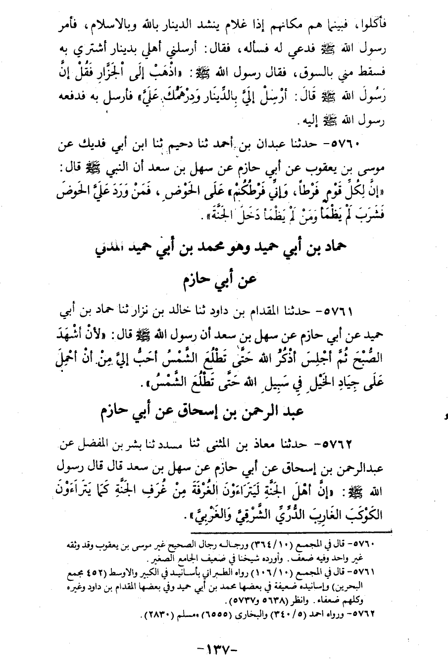 5761 - حَدَّثَنَا الْمِقْدَامُ بْنُ دَاوُدَ، ثنا خَالِدُ بْنُ نِزَارٍ، ثنا حَمَّادُ بْنُ أَبِي حُمَيْدٍ، عَنْ أَبِي حَازِمٍ، عَنْ سَهْلِ بْنِ سَعْدٍ، أَنَّ رَسُولَ اللهِ صَلَّى اللهُ عَلَيْهِ وَسَلَّمَ قَالَ: «§لَأَنْ أَشْهَدَ الصُّبْحَ، ثُمَّ أَجْلِسَ أَذْكُرُ اللهَ حَتَّى تَطْلُعَ الشَّمْسُ، أَحَبُّ إِلَيَّ مِنْ أَنْ أَحْمِلَ عَلَى جِيَادِ الْخَيْلِ فِي سَبِيلِ اللهِ حَتَّى تَطْلُعَ الشَّمْسُ»