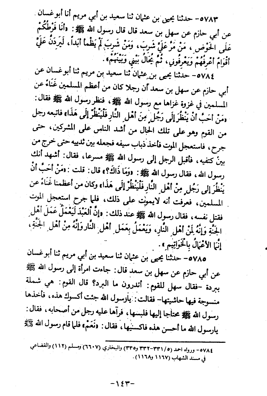 5783 - حَدَّثَنَا يَحْيَى بْنُ عُثْمَانَ، ثنا سَعِيدُ بْنُ أَبِي مَرْيَمَ، أَنَا أَبُو غَسَّانَ، عَنْ أَبِي حَازِمٍ، عَنْ سَهْلِ بْنِ سَعْدٍ قَالَ: قَالَ رَسُولُ اللهِ صَلَّى اللهُ عَلَيْهِ وَسَلَّمَ: «§أَنَا فَرَطُكُمْ عَلَى الْحَوْضِ، مَنْ مَرَّ عَلَيَّ شَرِبَ، وَمَنْ شَرِبَ لَمْ يَظْمَأْ أَبَدًا، لَيَرِدَنَّ عَلَيَّ أَقْوَامٌ أَعْرِفُهُمْ وَيَعْرِفُونِي، ثُمَّ يُحَالُ بَيْنِي وَبَيْنَهُمْ»