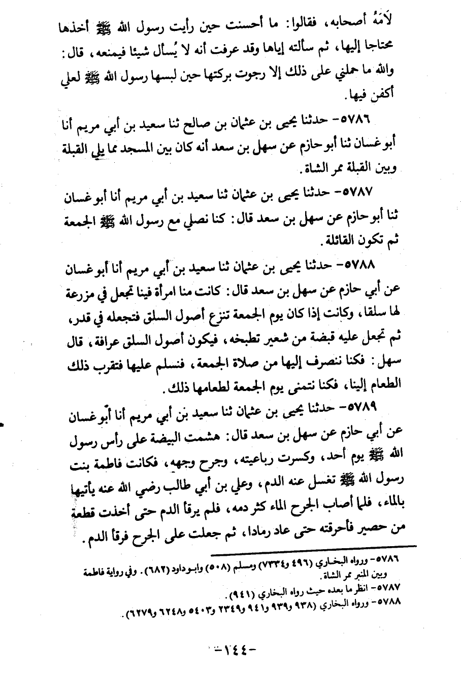 5789 - حَدَّثَنَا يَحْيَى بْنُ عُثْمَانَ، ثنا سَعِيدُ بْنُ أَبِي مَرْيَمَ، أَنَا أَبُو غَسَّانَ، عَنْ أَبِي حَازِمٍ، عَنْ سَهْلِ بْنِ سَعْدٍ قَالَ: «§هُشِّمَتِ الْبَيْضَةُ عَلَى رَأْسِ رَسُولِ اللهِ صَلَّى اللهُ عَلَيْهِ وَسَلَّمَ يَومَ أُحُدٍ، وَكُسِرَتْ رَبَاعِيَّتُهُ، وَجُرِحَ وَجْهُهُ، فَكَانَتْ فَاطِمَةُ بِنْتُ رَسُولِ اللهِ صَلَّى اللهُ عَلَيْهِ وَسَلَّمَ تَغْسِلُ عَنْهُ الدَّمَ، وَعَلِيُّ بْنُ أَبِي طَالِبٍ رَضِيَ اللهُ عَنْهُ يَأْتِيهَا بِالْمَاءِ، فَلَمَّا أَصَابَ الْجُرْحَ الْمَاءُ، كَثُرَ دَمُهُ فَلَمْ يَرْقَأِ الدَّمُ، حَتَّى أَخَذَتْ قِطْعَةً مِنْ حَصِيرٍ، فَأَحْرَقَتْهُ حَتَّى عَادَ رَمَادًا، ثُمَّ جَعَلَتْ عَلَى الْجُرْحِ، فَرَقَأَ الدَّمُ»