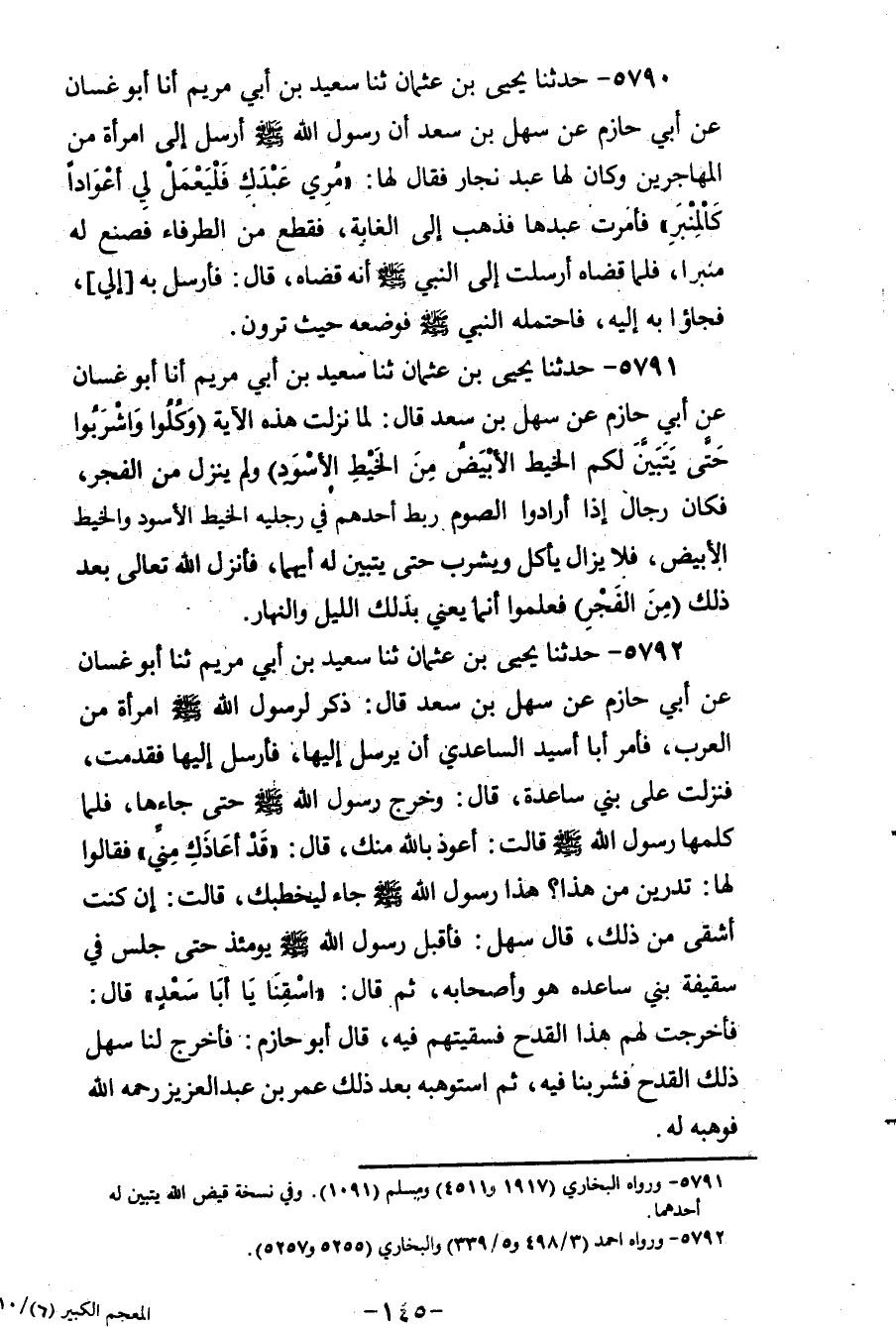 5791 - حَدَّثَنَا يَحْيَى بْنُ عُثْمَانَ، ثنا سَعِيدُ بْنُ أَبِي مَرْيَمَ، أَنَا أَبُو غَسَّانَ، عَنْ أَبِي حَازِمٍ، عَنْ سَهْلِ بْنِ سَعْدٍ قَالَ: " لَمَّا نَزَلَتْ هَذِهِ الْآيَةُ: {وَكُلُوا وَاشْرَبُوا حَتَّى يَتَبَيَّنَ لَكُمُ الْخَيْطُ الْأَبْيَضُ مِنَ الْخَيْطِ الْأَسْوَدِ} [البقرة: 187] ، §وَلَمْ يَنْزِلْ مِنَ الْفَجْرِ، فَكَانَ رِجَالٌ إِذَا أَرَادُوا الصَّوْمَ، رَبَطَ أَحَدُهُمْ فِي رِجْلَيْهِ الْخَيْطَ الْأَسْوَدَ وَالْخَيْطَ الْأَبْيَضَ، فَلَا يَزَالُ يَأْكُلُ وَيَشْرَبُ حَتَّى يَتَبَيَّنَ لَهُ أَيُّهُمَا، فَأَنْزَلَ اللهُ تَعَالَى بَعْدَ ذَلِكَ: {مِنَ الْفَجْرِ} [البقرة: 187] ، فَعَلِمُوا أَنَّمَا يَعْنِي بِذَلِكَ اللَّيْلَ وَالنَّهَارَ "