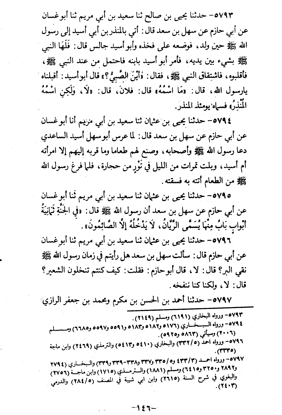 5793 - حَدَّثَنَا يَحْيَى بْنُ صَالِحٍ، ثنا سَعِيدُ بْنُ أَبِي مَرْيَمَ، ثنا أَبُو غَسَّانَ، عَنْ أَبِي حَازِمٍ، عَنْ سَهْلِ بْنِ سَعْدٍ قَالَ: §أُتِيَ بِالْمُنْذِرِ بْنِ أَبِي أُسَيْدٍ إِلَى رَسُولِ اللهِ صَلَّى اللهُ عَلَيْهِ وَسَلَّمَ حِينَ وُلِدَ، فَوَضَعَهُ عَلَى فَخِذِهِ وَأَبُو أُسَيْدٍ جَالِسٌ، قَالَ: فَلَهَا النَّبِيُّ صَلَّى اللهُ عَلَيْهِ وَسَلَّمَ بِشَيْءٍ بَيْنَ يَدَيْهِ، فَأَمَرَ أَبُو أُسَيْدٍ بِابْنِهِ، فَاحْتُمِلَ مِنْ عِنْدِ النَّبِيِّ صَلَّى اللهُ عَلَيْهِ وَسَلَّمَ، فَأَقْلَبُوهُ فَاشْتَاقَ النَّبِيُّ صَلَّى اللهُ عَلَيْهِ وَسَلَّمَ، فَقَالَ: «أَيْنَ الصَّبِيُّ؟» ، قَالَ أَبُو أُسَيْدٍ أَقْلَبْنَاهُ يَا رَسُولَ اللهِ، قَالَ: «مَا اسْمُهُ؟» ، قَالَ: فُلَانٌ، قَالَ: «لَا وَلَكِنِ اسْمُهُ الْمُنْذِرُ» ، فَسَمَّاهُ يَوْمَئِذٍ الْمُنْذِرَ
