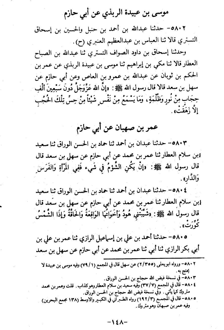 5802 - حَدَّثَنَا عَبْدُ اللهِ بْنُ أَحْمَدَ بْنِ حَنْبَلٍ، وَالْحُسَيْنُ بْنُ إِسْحَاقَ التُّسْتَرِيُّ قَالَا: ثنا الْعَبَّاسُ بْنُ عَبْدِ الْعَظِيمِ الْعَنْبَرِيُّ، ح وَحَدَّثَنَا إِسْحَاقُ بْنُ دَاوُدَ الصَّوَّافُ التُّسْتَرِيُّ، ثنا عَبْدُ اللهِ بْنُ الصَّبَّاحِ الْعَطَّارُ قَالَا: ثنا مَكِّيُّ بْنُ إِبْرَاهِيمَ، ثنا مُوسَى بْنُ عُبَيْدَةَ الرَّبَذِيُّ، عَنْ عُمَرَ بْنِ الْحَكَمِ بْنِ ثَوْبَانَ، عَنْ عَبْدِ اللهِ بْنِ عَمْرِو بْنِ الْعَاصِ، وَعَنْ أَبِي حَازِمٍ، عَنْ سَهْلِ بْنِ سَعْدٍ قَالَا: قَالَ رَسُولُ اللهِ صَلَّى اللهُ عَلَيْهِ وَسَلَّمَ: «إِنَّ §اللهَ عَزَّ وَجَلَّ دُونَ سَبْعِينَ أَلْفَ حِجَابٍ مِنْ نُورٍ وَظُلْمَةٍ، وَمَا يَسْمَعُ مِنْ نَفْسٍ شَيْئًا مِنْ حِسِّ تِلْكَ الْحُجُبِ إِلَّا زَهَقَتْ»