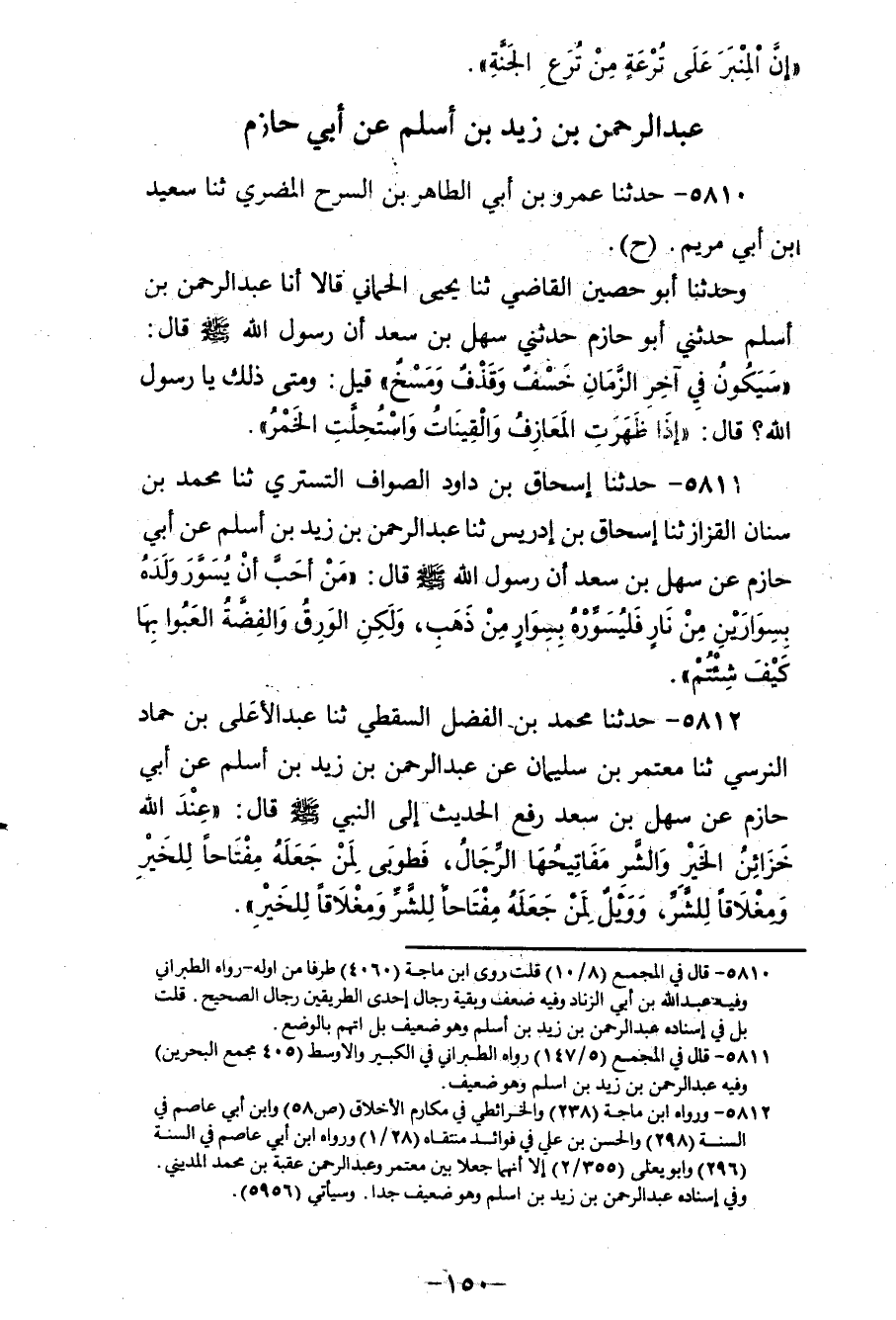 5810 - حَدَّثَنَا عَمْرُو بْنُ أَبِي الطَّاهِرِ بْنِ السَّرْحِ الْمُضَرِيُّ، ثنا سَعِيدُ بْنُ أَبِي مَرْيَمَ، ح وَحَدَّثَنَا أَبُو حُصَيْنٍ الْقَاضِي، ثنا يَحْيَى الْحِمَّانِيُّ قَالَا: أَنَا عَبْدُ الرَّحْمَنِ بْنُ أَسْلَمَ، حَدَّثَنِي أَبُو حَازِمٍ، حَدَّثَنِي سَهْلُ بْنُ سَعْدٍ، أَنَّ رَسُولَ اللهِ صَلَّى اللهُ عَلَيْهِ وَسَلَّمَ قَالَ: «§سَيَكُونُ فِي آخِرِ الزَّمَانِ خَسْفٌ وَقَذْفٌ وَمَسْخٌ» ، قِيلَ: وَمَتَى ذَلِكَ يَا رَسُولَ اللهِ؟ قَالَ: «إِذَا ظَهَرَتِ الْمَعَازِفُ وَالْقَيْنَاتُ، وَاسْتُحِلَّتِ الْخَمْرُ»