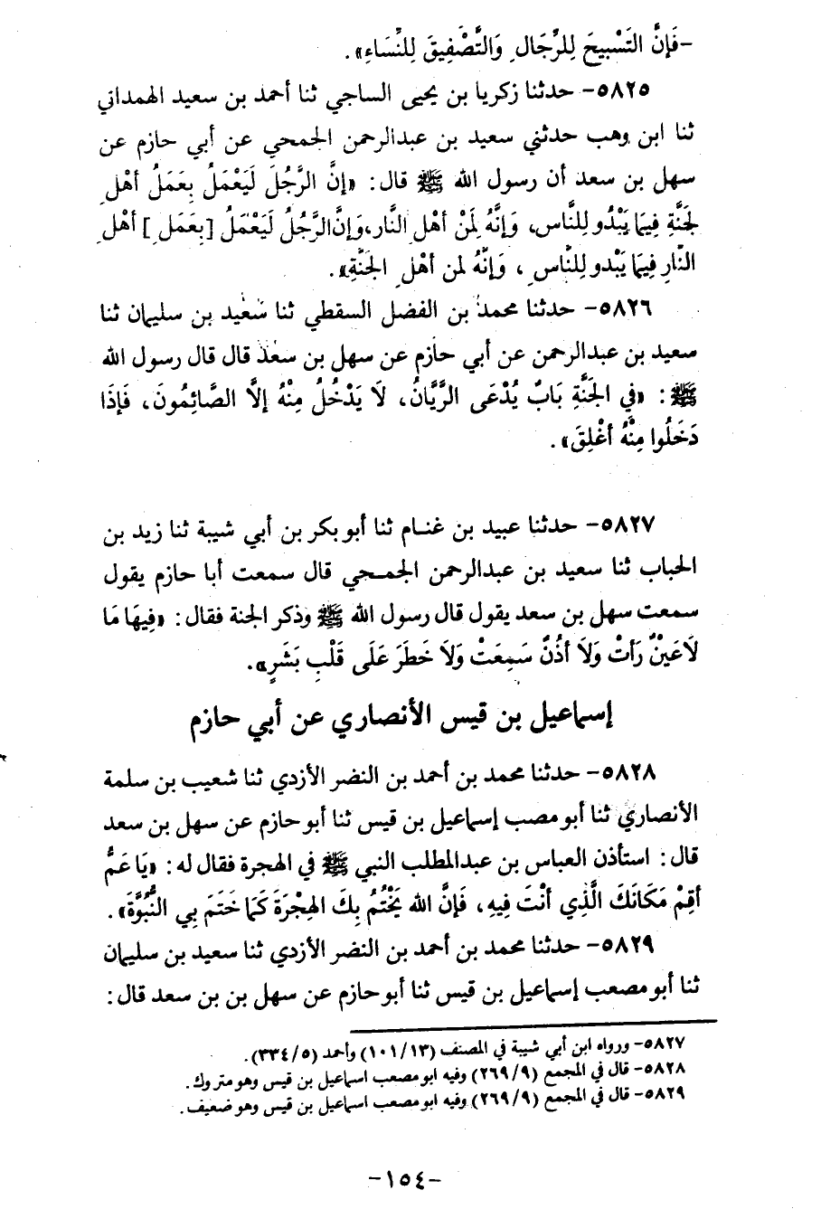 5825 - حَدَّثَنَا زَكَرِيَّا بْنُ يَحْيَى السَّاجِيُّ، ثنا أَحْمَدُ بْنُ سَعِيدٍ الْهَمْدَانِيُّ، ثنا ابْنُ وَهْبٍ، حَدَّثَنِي سَعِيدُ بْنُ عَبْدِ الرَّحْمَنِ الْجُمَحِيُّ، عَنْ أَبِي حَازِمٍ، عَنْ سَهْلِ بْنِ سَعْدٍ، أَنَّ رَسُولَ اللهِ صَلَّى اللهُ عَلَيْهِ وَسَلَّمَ قَالَ: «إِنَّ §الرَّجُلَ لَيَعْمَلُ بِعَمَلِ أَهْلِ الْجَنَّةِ فِيمَا يَبْدُو لِلنَّاسِ، وَإِنَّهُ لَمِنْ أَهْلِ النَّارِ، وَإِنَّ الرَّجُلَ لَيَعْمَلُ بِعَمَلِ أَهْلِ النَّارِ فِيمَا يَبْدُو لِلنَّاسِ، وَإِنَّهُ لَمِنْ أَهْلِ الْجَنَّةِ»