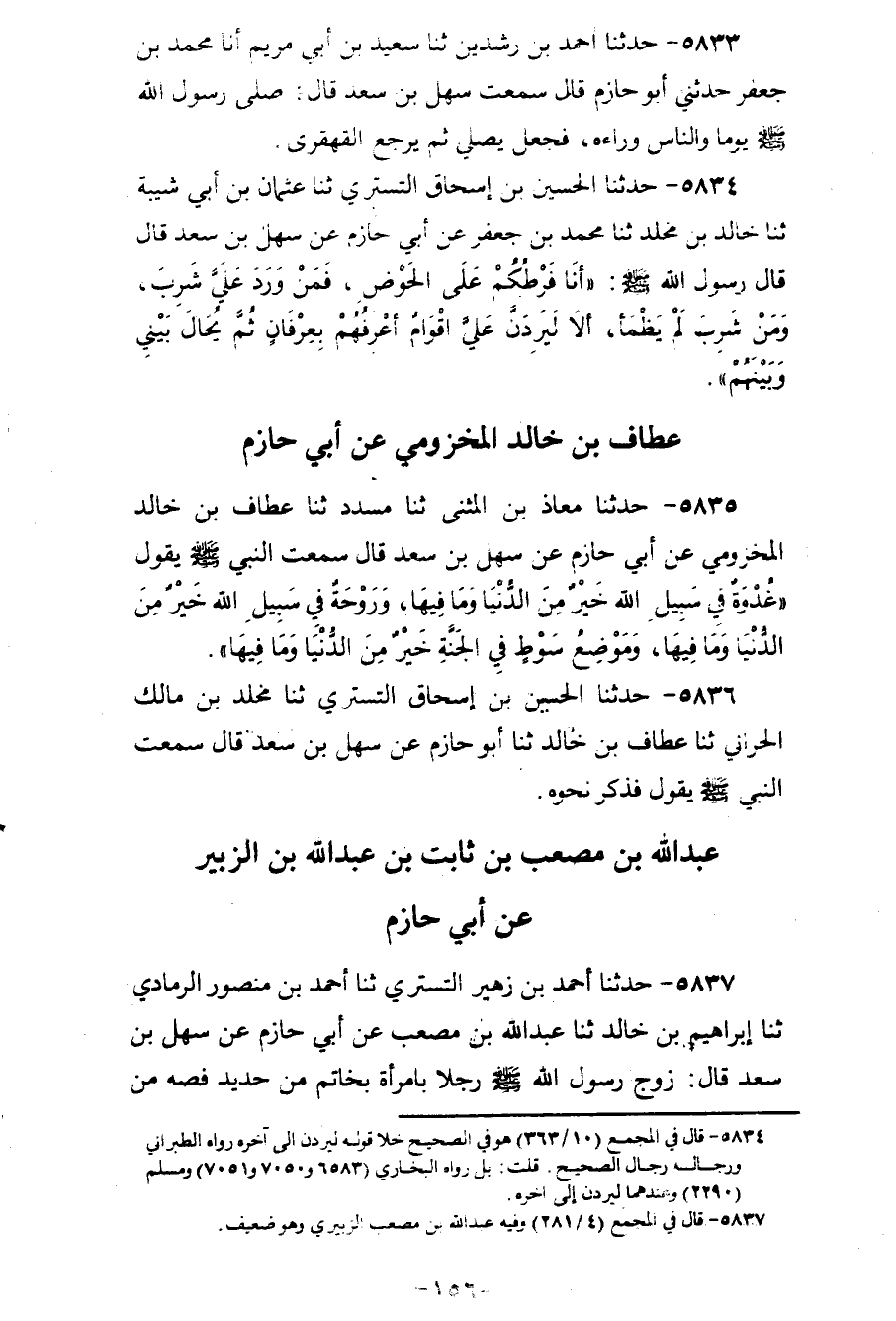 5835 - حَدَّثَنَا مُعَاذُ بْنُ الْمُثَنَّى، ثنا مُسَدَّدٌ، ثنا عَطَّافُ بْنُ خَالِدٍ الْمَخْزُومِيُّ، عَنْ أَبِي حَازِمٍ، عَنْ سَهْلِ بْنِ سَعْدٍ قَالَ: سَمِعْتُ النَّبِيَّ صَلَّى اللهُ عَلَيْهِ وَسَلَّمَ يَقُولُ: «§غَدْوَةٌ فِي سَبِيلِ اللهِ خَيْرٌ مِنَ الدُّنْيَا وَمَا فِيهَا، وَرَوْحَةٌ فِي سَبِيلِ اللهِ خَيْرٌ مِنَ الدُّنْيَا وَمَا فِيهَا، وَمَوْضِعُ سَوْطٍ فِي الْجَنَّةِ خَيْرٌ مِنَ الدُّنْيَا وَمَا فِيهَا»