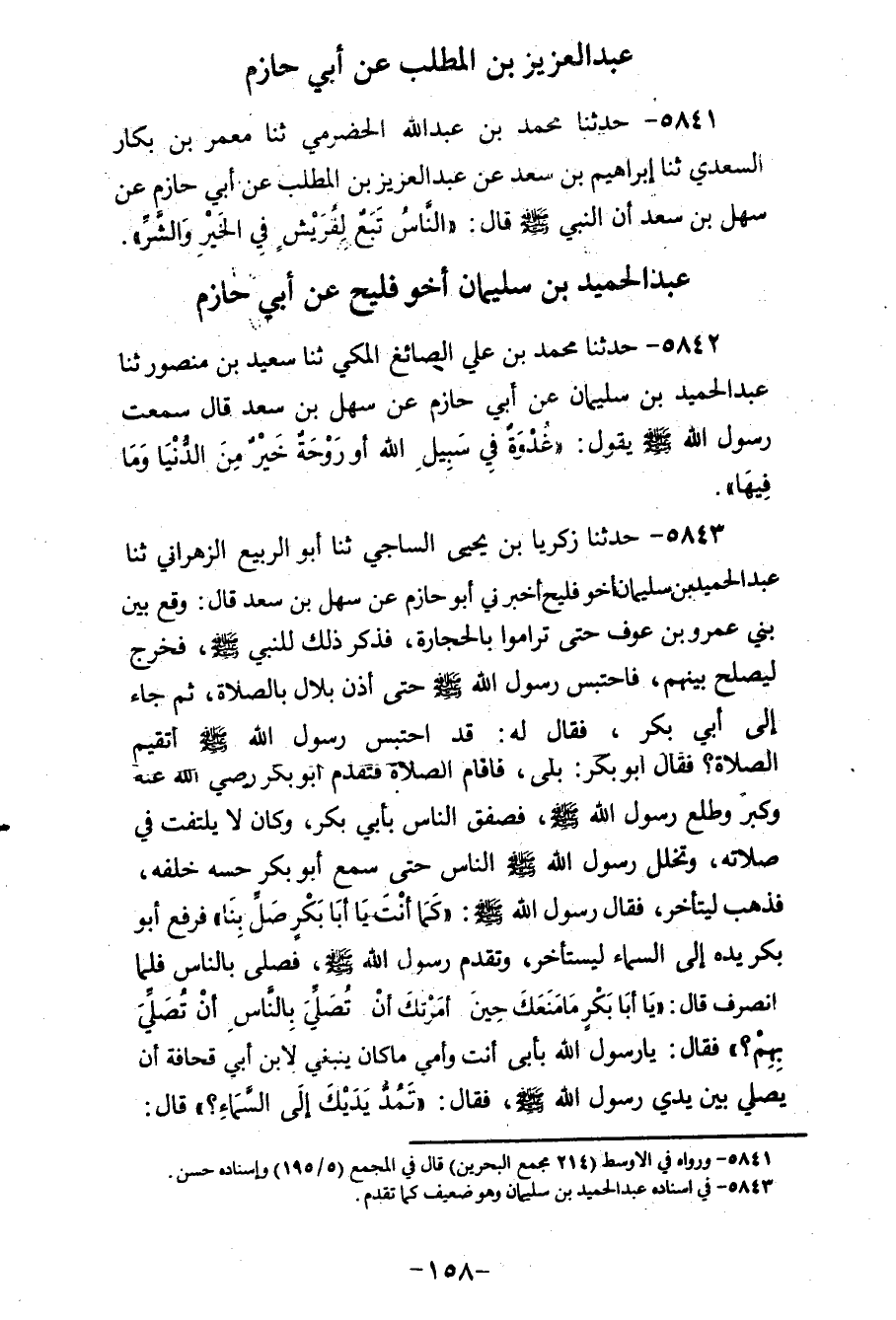 5841 - حَدَّثَنَا مُحَمَّدُ بْنُ عَبْدِ اللهِ الْحَضْرَمِيُّ، ثنا مَعْمَرُ بْنُ بَكَّارٍ السَّعْدِيُّ، ثنا إِبْرَاهِيمُ بْنُ سَعْدٍ، عَنْ عَبْدِ الْعَزِيزِ بْنِ الْمُطَّلِبِ، عَنْ أَبِي حَازِمٍ، عَنْ سَهْلِ بْنِ سَعْدٍ، أَنَّ النَّبِيَّ صَلَّى اللهُ عَلَيْهِ وَسَلَّمَ قَالَ: «§النَّاسُ تَبَعٌ لِقُرَيْشٍ فِي الْخَيْرِ وَالشَّرِّ»
