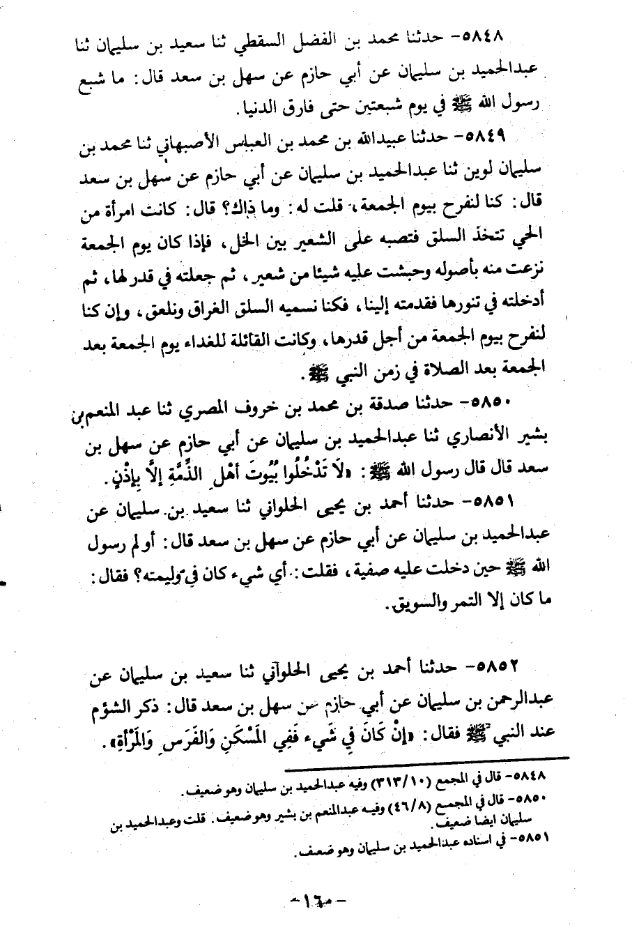 5849 - حَدَّثَنَا عُبَيْدُ اللهِ بْنُ مُحَمَّدِ بْنِ الْعَبَّاسِ الْأَصْبَهَانِيُّ، ثنا مُحَمَّدُ بْنُ سُلَيْمَانَ لُوَيْنٌ، ثنا عَبْدُ الْحَمِيدِ بْنُ سُلَيْمَانَ، عَنْ أَبِي حَازِمٍ، عَنْ سَهْلِ بْنِ سَعْدٍ قَالَ: «§كُنَّا لَنَفْرَحُ بِيَوْمِ الْجُمُعَةِ» ، قُلْتُ لَهُ: وَمَا ذَاكَ؟ قَالَ: «كَانَتِ امْرَأَةٌ مِنِ الْحَيِّ تَتَّخِذُ السِّلْقَ فَتَصُبُّهُ عَلَى الشَّعِيرِ بَيْنَ الْخَلِّ، فَإِذَا كَانَ يَوْمُ الْجُمُعَةِ نَزَعَتْ مِنْهُ بأُصُولِهِ، وحَبَشَتْ عَلَيْهِ شَيْئًا مِنْ شَعِيرٍ، ثُمَّ جَعَلْتَهُ فِي قِدْرٍ لَهَا، ثُمَّ أَدْخَلَتْهُ فِي تَنُّورِهَا فَقَدَّمَتْهُ إِلَيْنَا، فَكُنَّا نُسَمِّيهِ السِّلْقَ الْغَرَّاقَ، ونَلْعَقُ، وَإِنْ كُنَّا لَنَفْرَحُ بِيَوْمِ الْجُمُعَةِ مِنْ أَجْلِ قِدْرِهَا، وَكَانَتِ الْقَائِلَةُ لِلْغَدَاءِ يَوْمَ الْجُمُعَةِ بَعْدَ الْجُمُعَةِ بَعْدَ الصَّلَاةِ فِي زَمَنِ النَّبِيِّ صَلَّى اللهُ عَلَيْهِ وَسَلَّمَ»