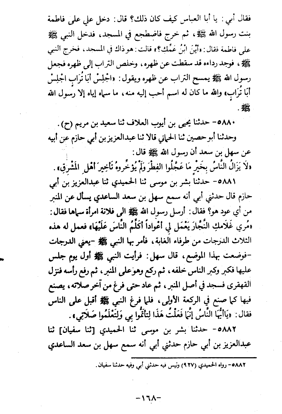 5881 - حَدَّثَنَا بِشْرُ بْنُ مُوسَى، ثنا الْحُمَيْدِيُّ، ثنا عَبْدُ الْعَزِيزِ بْنُ أَبِي حَازِمٍ قَالَ: حَدَّثَنِي أَبِي أَنَّهُ سَمِعَ سَهْلَ بْنَ سَعْدٍ السَّاعِدِيَّ يَسْأَلُ عَنِ الْمِنْبَرِ: مِنْ أَيِّ عُودٍ هُوَ؟ فَقَالَ: أَرْسَلَ رَسُولُ اللهِ صَلَّى اللهُ عَلَيْهِ وَسَلَّمَ إِلَى فُلَانَةَ، امْرَأَةٍ سَمَّاهَا، فَقَالَ: «مُرِي غُلَامَكِ النَّجَّارَ يَعْمَلُ لِي أَعْوَادًا أُكَلِّمُ النَّاسَ عَلَيْهَا» ، فَعَمِلَ لَهُ هَذِهِ الثَّلَاثَ الدَّرَجَاتِ مِنْ طَرْفَاءِ الْغَابَةِ، فَأَمَرَ بِهَا النَّبِيُّ صَلَّى اللهُ عَلَيْهِ وَسَلَّمَ - يَعْنِي الدَّرَجَاتِ - فَوُضِعَتْ بِهَذَا الْمَوْضِعِ، قَالَ سَهْلٌ: فَرَأَيْتُ النَّبِيَّ صَلَّى اللهُ عَلَيْهِ وَسَلَّمَ أَوَّلَ يَوْمٍ جَلَسَ عَلَيْهَا فَكَبَّرَ، وَكَبَّرَ النَّاسُ خَلْفَهُ، ثُمَّ رَكَعَ وَهُوَ عَلَى الْمِنْبَرِ، ثُمَّ رَفَعَ رَأْسَهُ، فَنَزَلَ الْقَهْقَرَى، فَسَجَدَ فِي أَصْلِ الْمِنْبَرِ، ثُمَّ عَادَ حَتَّى فَرَغَ مِنْ آخِرِ صَلَاتِهِ، يَصْنَعُ فِيهَا كَمَا صَنَعَ فِي الرَّكْعَةِ الْأُولَى، فَلَمَّا فَرَغَ النَّبِيُّ صَلَّى اللهُ عَلَيْهِ وَسَلَّمَ أَقْبَلَ عَلَى النَّاسِ، فَقَالَ: «يَا أَيُّهَا النَّاسُ، §إِنَّمَا فَعَلْتُ هَذِهِ لِتَأْتَمُّوا بِي، وَلِتَعْلَمُوا صَلَاتِي»