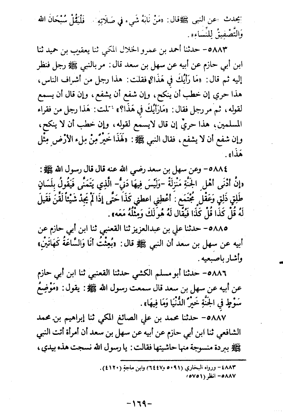 5883 - حَدَّثَنَا أَحْمَدُ بْنُ عَمْرٍو الْخَلَّالُ الْمَكِّيُّ، ثنا يَعْقُوبُ بْنُ حُمَيْدٍ، ثنا ابْنُ أَبِي حَازِمٍ، عَنْ أَبِيهِ، عَنْ سَهْلِ بْنِ سَعْدٍ قَالَ: مَرَّ بِالنَّبِيِّ صَلَّى اللهُ عَلَيْهِ وَسَلَّمَ رَجُلٌ، فَنَظَرَ إِلَيْهِ، ثُمَّ قَالَ: «مَا رَأْيُكَ فِي هَذَا؟» فَقُلْتُ: هَذَا رَجُلٌ مِنْ أَشْرَافِ النَّاسِ، هَذَا حَرِيٌّ إِنْ خَطَبَ أَنْ يُنْكَحَ، وَإِنْ شَفَعَ أَنْ يُشَفَّعَ، وَإِنْ قَالَ أَنْ يُسْمَعَ لِقَوْلِهِ، ثُمَّ مَرَّ رَجُلٌ، فَقَالَ: «مَا رَأْيُكَ فِي هَذَا؟» ، فقُلْتُ: هَذَا رَجُلٌ مِنْ فُقَرَاءِ الْمُسْلِمِينَ، هَذَا حَرِيٌّ إِنْ قَالَ أَنْ لَا يُسْمَعَ لِقَوْلِهِ، وَإِنْ خَطَبَ أَنْ لَا يُنْكَحَ، وَإِنْ شَفَعَ أَنْ لَا يُشَفَّعَ، فَقَالَ النَّبِيُّ صَلَّى اللهُ عَلَيْهِ وَسَلَّمَ: «§لَهَذَا خَيْرٌ مِنْ مِلْءِ الْأَرْضِ مِثْلَ هَذَا»