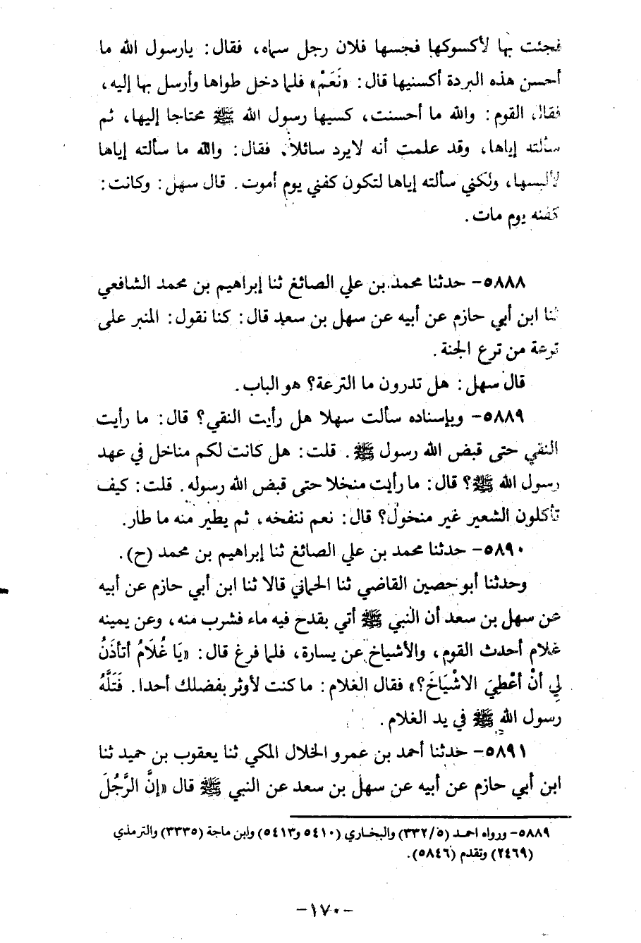 5889 - وَبِإِسْنَادِهِ سَأَلْتُ سَهْلًا: هَلْ رَأَيْتَ النِّقْيَ؟ قَالَ: «§مَا رَأَيْتُ النِّقْيَ حَتَّى قَبَضَ اللهُ رَسُولَ اللهِ صَلَّى اللهُ عَلَيْهِ وَسَلَّمَ» ، قُلْتُ: هَلْ كَانَتْ لَكُمْ مَنَاخِلُ فِي عَهْدِ رَسُولِ اللهِ صَلَّى اللهُ عَلَيْهِ وَسَلَّمَ؟ قَالَ: «مَا رَأَيْتُ مُنْخُلًا حَتَّى قَبَضَ اللهُ رَسُولَهُ» ، قُلْتُ: كَيْفَ تَأْكُلُونَ الشَّعِيرَ غَيْرَ مَنْخُولٍ؟ قَالَ: «نَعَمْ نَنْفُخُهُ، ثُمَّ يَطِيرُ مِنْهُ مَا طَارَ»