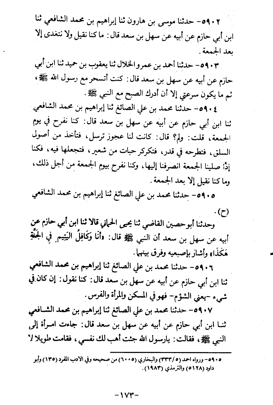 5904 - حَدَّثَنَا مُحَمَّدُ بْنُ عَلِيٍّ الصَّائِغُ، ثنا إِبْرَاهِيمُ بْنُ مُحَمَّدٍ الشَّافِعِيُّ، ثنا ابْنُ أَبِي حَازِمٍ، عَنْ أَبِيهِ، عَنْ سَهْلِ بْنِ سَعْدٍ قَالَ: «كُنَّا نَفْرَحُ فِي يَوْمِ الْجُمُعَةِ» ، قُلْتُ: وَلِمَ؟ قَالَ: «§كَانَتْ لَنَا عَجُوزٌ تُرْسِلُ، فَتَأْخُذُ مِنْ أُصُولِ السِّلْقِ، فَتَطْرَحُهُ فِي قِدْرٍ فَتُكَرْكِرُ حَبَّاتٍ مِنْ شَعِيرٍ، فَتَجْعَلُهَا فِيهِ، فَكُنَّا إِذَا صَلَّيْنَا الْجُمُعَةَ انْصَرَفْنَا إِلَيْهَا، وَكُنَّا نَفْرَحُ بِيَوْمِ الْجُمُعَةِ مِنْ أَجْلِ ذَلِكَ، وَمَا كُنَّا نَقِيلُ، إِلَّا بَعْدَ الْجُمُعَةِ»