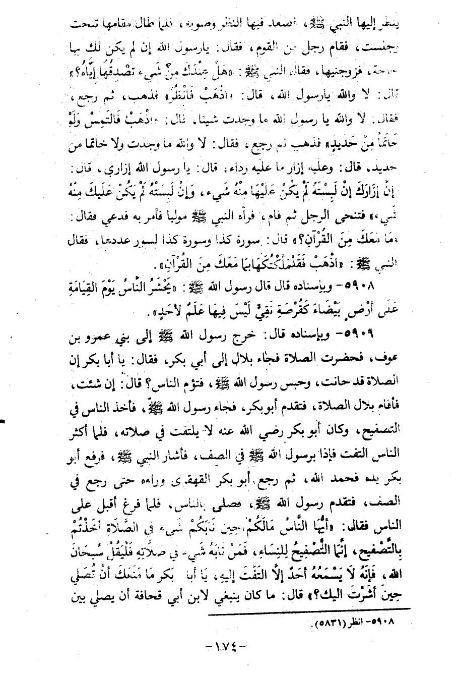 5909 - وَبِإِسْنَادِهِ قَالَ: خَرَجَ رَسُولُ اللهِ صَلَّى اللهُ عَلَيْهِ وَسَلَّمَ إِلَى بَنِي عَمْرِو بْنِ عَوْفٍ فَحَضَرَتِ الصَّلَاةُ، فَجَاءَ بِلَالٌ إِلَى أَبِي بَكْرٍ، فَقَالَ: يَا أَبَا بَكْرٍ إِنَّ الصَّلَاةَ قَدْ حَانَتْ، وَحُبِسَ رَسُولُ اللهِ صَلَّى اللهُ عَلَيْهِ وَسَلَّمَ فَتَؤُمُّ النَّاسَ؟ قَالَ: إِنْ شِئْتَ، فَأَقَامَ بِلَالٌ الصَّلَاةَ، فَتَقَدَّمَ أَبُو بَكْرٍ فَجَاءَ رَسُولُ اللهِ صَلَّى اللهُ عَلَيْهِ وَسَلَّمَ، فَأَخَذَ النَّاسُ فِي التَّصْفِيحِ، وَكَانَ أَبُو بَكْرٍ رَضِيَ اللهُ عَنْهُ لَا يَلْتَفِتُ فِي صَلَاتِهِ، فَلَمَّا أَكْثَرَ النَّاسُ الْتَفَتَ، فَإِذَا بِرَسُولِ اللهِ صَلَّى اللهُ عَلَيْهِ وَسَلَّمَ فِي الصَّفِّ، فَأَشَارَ النَّبِيُّ صَلَّى اللهُ عَلَيْهِ وَسَلَّمَ، فَرَفَعَ أَبُو بَكْرٍ يَدَهُ، فَحَمِدَ اللهَ، ثُمَّ رَجَعَ أَبُو بَكْرٍ الْقَهْقَرَى وَرَاءَهُ حَتَّى رَجَعَ فِي الصَّفِّ، فَتَقَدَّمَ رَسُولُ اللهِ صَلَّى اللهُ عَلَيْهِ وَسَلَّمَ، فَصَلَّى بِالنَّاسِ، فَلَمَّا فَرَغَ أَقْبَلَ عَلَى النَّاسِ، فَقَالَ: " أَيُّهَا النَّاسُ، مَا لَكُمْ حِينَ نَابَكُمْ شَيْءٌ فِي الصَّلَاةِ أَخَذْتُمْ بِالتَّصْفِيحِ، إِنَّمَا التَّصْفِيحُ لِلنِّسَاءِ، §فَمَنْ نَابَهُ شَيْءٌ فِي صَلَاتِهِ، فَلْيَقُلْ: سُبْحَانَ اللهِ، فَإِنَّهُ لَا يَسْمَعُهُ أَحَدٌ إِلَّا الْتَفَتَ إِلَيْهِ. يَا أَبَا بَكْرٍ مَا مَنَعَكَ أَنْ تُصَلِّيَ حِينَ أَشَرْتُ إِلَيْكَ؟ "، قَالَ: مَا كَانَ يَنْبَغِي لِابْنِ أَبِي قُحَافَةَ أَنْ يُصَلِّيَ بَيْنَ يَدَيْ رَسُولِ اللهِ صَلَّى اللهُ عَلَيْهِ وَسَلَّمَ