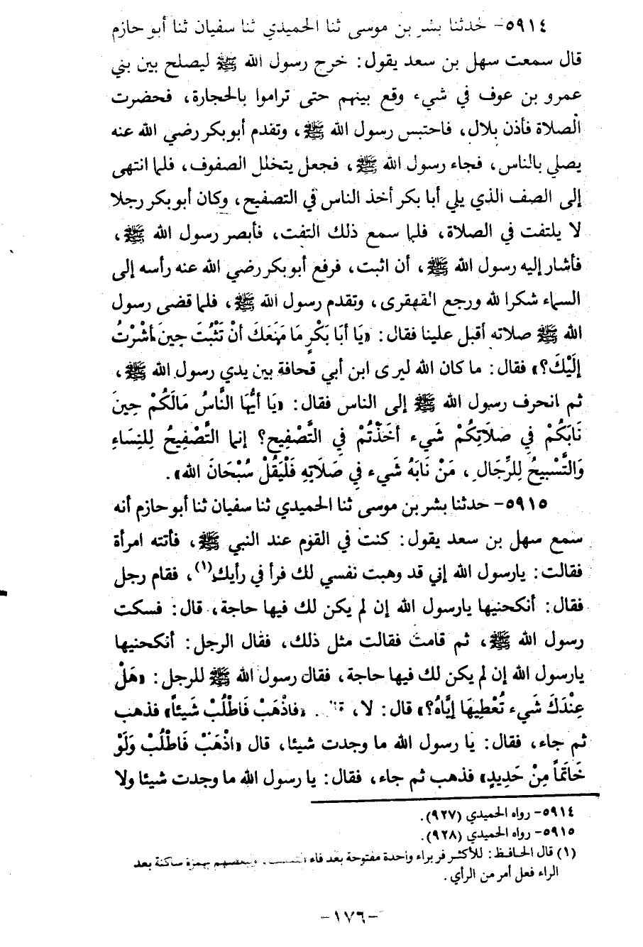 5914 - حَدَّثَنَا بِشْرُ بْنُ مُوسَى، ثنا الْحُمَيْدِيُّ، ثنا سُفْيَانُ، ثنا أَبُو حَازِمٍ، قَالَ: سَمِعْتُ سَهْلَ بْنَ سَعْدٍ يَقُولُ: خَرَجَ رَسُولُ اللهِ صَلَّى اللهُ عَلَيْهِ وَسَلَّمَ لِيُصْلِحَ بَيْنَ بَنِي عَمْرِو بْنِ عَوْفٍ فِي شَيْءٍ وَقَعَ بَيْنَهُمْ، حَتَّى تَرَامَوْا بِالْحِجَارَةِ، فَحَضَرَتِ الصَّلَاةُ، فَأَذَّنَ بِلَالٌ، فَاحْتَبَسَ رَسُولُ اللهِ صَلَّى اللهُ عَلَيْهِ وَسَلَّمَ، وَتَقَدَّمَ أَبُو بَكْرٍ رَضِيَ اللهُ عَنْهُ يُصَلِّي بِالنَّاسِ، فَجَاءَ رَسُولُ اللهِ صَلَّى اللهُ عَلَيْهِ وَسَلَّمَ، فَجَعَلَ يَتَخَلَّلُ الصُّفُوفَ، فَلَمَّا انْتَهَى إِلَى الصَّفِّ الَّذِي يَلِي أَبَا بَكْرٍ أَخَذَ النَّاسُ فِي التَّصْفِيحِ، وَكَانَ أَبُو بَكْرٍ رَجُلًا لَا يَلْتَفِتُ فِي الصَّلَاةِ، فَلَمَّا سَمِعَ ذَلِكَ الْتَفَتَ، فَأَبْصَرَ رَسُولَ اللهِ صَلَّى اللهُ عَلَيْهِ وَسَلَّمَ، فَأَشَارَ إِلَيْهِ رَسُولُ اللهِ صَلَّى اللهُ عَلَيْهِ وَسَلَّمَ أَنِ اثْبُتْ، فَرَفَعَ أَبُو بَكْرٍ رَضِيَ اللهُ عَنْهُ رَأْسَهُ إِلَى السَّمَاءِ شُكْرًا لِلَّهِ، وَرَجَعَ الْقَهْقَرَى، وَتَقَدَّمَ رَسُولُ اللهِ صَلَّى اللهُ عَلَيْهِ وَسَلَّمَ، فَلَمَّا قَضَى رَسُولُ اللهِ صَلَّى اللهُ عَلَيْهِ وَسَلَّمَ صَلَاتَهُ أَقْبَلَ عَلَيْنَا، فَقَالَ: «يَا أَبَا بَكْرٍ مَا مَنَعَكَ أَنْ تَثْبُتَ حِينَ أَشَرْتُ إِلَيْكَ؟» فَقَالَ: مَا كَانَ اللهُ لِيَرَى: ابْنَ أَبِي قُحَافَةَ بَيْنَ يَدَيْ رَسُولِ اللهِ صَلَّى اللهُ عَلَيْهِ وَسَلَّمَ، ثُمَّ انْحَرَفَ رَسُولُ اللهِ صَلَّى اللهُ عَلَيْهِ وَسَلَّمَ إِلَى النَّاسِ، فَقَالَ: " يَا أَيُّهَا النَّاسُ، مَا لَكُمْ حِينَ نَابَكُمْ فِي صَلَاتِكُمْ شَيْءٌ أَخَذْتُمْ فِي التَّصْفِيحِ؟ إِنَّمَا التَّصْفِيحُ لِلنِّسَاءِ، وَالتَّسْبِيحُ لِلرِّجَالِ §مَنْ نَابَهُ شَيْءٌ فِي صَلَاتِهِ فَلْيَقُلْ: سُبْحَانَ اللهِ "