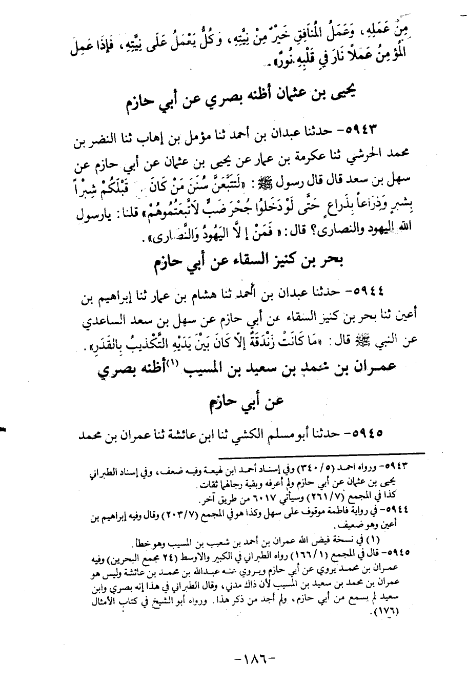 5943 - حَدَّثَنَا عَبْدَانُ بْنُ أَحْمَدَ، ثنا مُؤَمَّلُ بْنُ إِهَابٍ، ثنا النَّضْرُ بْنُ مُحَمَّدٍ الْحَرَشِيُّ، ثنا عِكْرِمَةُ بْنُ عَمَّارٍ، عَنْ يَحْيَى بْنِ عُثْمَانَ، عَنْ أَبِي حَازِمٍ، عَنْ سَهْلِ بْنِ سَعْدٍ قَالَ: قَالَ رَسُولُ اللهِ صَلَّى اللهُ عَلَيْهِ وَسَلَّمَ: «§لَتَتَّبِعُنَّ سُنَنَ مَنْ كَانَ قَبْلَكُمْ، شِبْرًا بِشِبْرٍ، وَذِرَاعًا بِذِرَاعٍ، حَتَّى لَوْ دَخَلُوا جُحْرَ ضَبٍّ لَاتَّبَعْتُمُوهُمْ» ، قُلْنَا: يَا رَسُولَ اللهِ الْيَهُودُ وَالنَّصَارَى؟ قَالَ: «فَمَنْ إِلَّا الْيَهُودُ وَالنَّصَارَى»