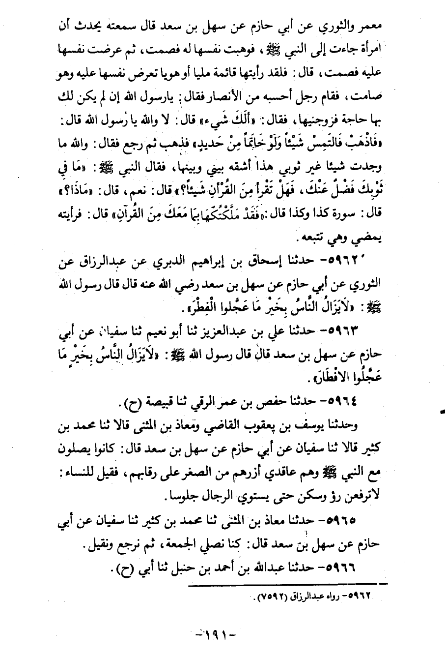 5964 - حَدَّثَنَا حَفْصُ بْنُ عُمَرَ الرَّقِّيُّ، ثنا قَبِيصَةُ، ح وَحَدَّثَنَا يُوسُفُ بْنُ يَعْقُوبَ الْقَاضِي، وَمُعَاذُ بْنُ الْمُثَنَّى قَالَا: ثنا مُحَمَّدُ بْنُ كَثِيرٍ قَالَا: ثنا سُفْيَانُ، عَنْ أَبِي حَازِمٍ، عَنْ سَهْلِ بْنِ سَعْدٍ قَالَ: " كَانُوا §يُصَلُّونَ مَعَ النَّبِيِّ صَلَّى اللهُ عَلَيْهِ وَسَلَّمَ وَهُمْ عَاقِدِي أُزُرَهُمْ مِنَ الصِّغَرِ عَلَى رِقَابِهِمْ، فَقِيلَ لِلنِّسَاءِ: لَا تَرْفَعْنَ رُءُوسَكُنَّ حَتَّى يَسْتَوِيَ الرِّجَالُ جُلُوسًا "